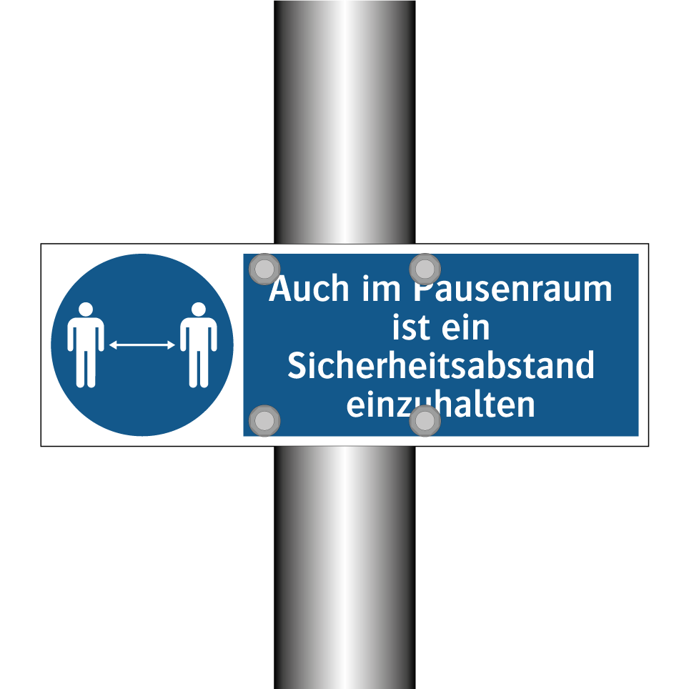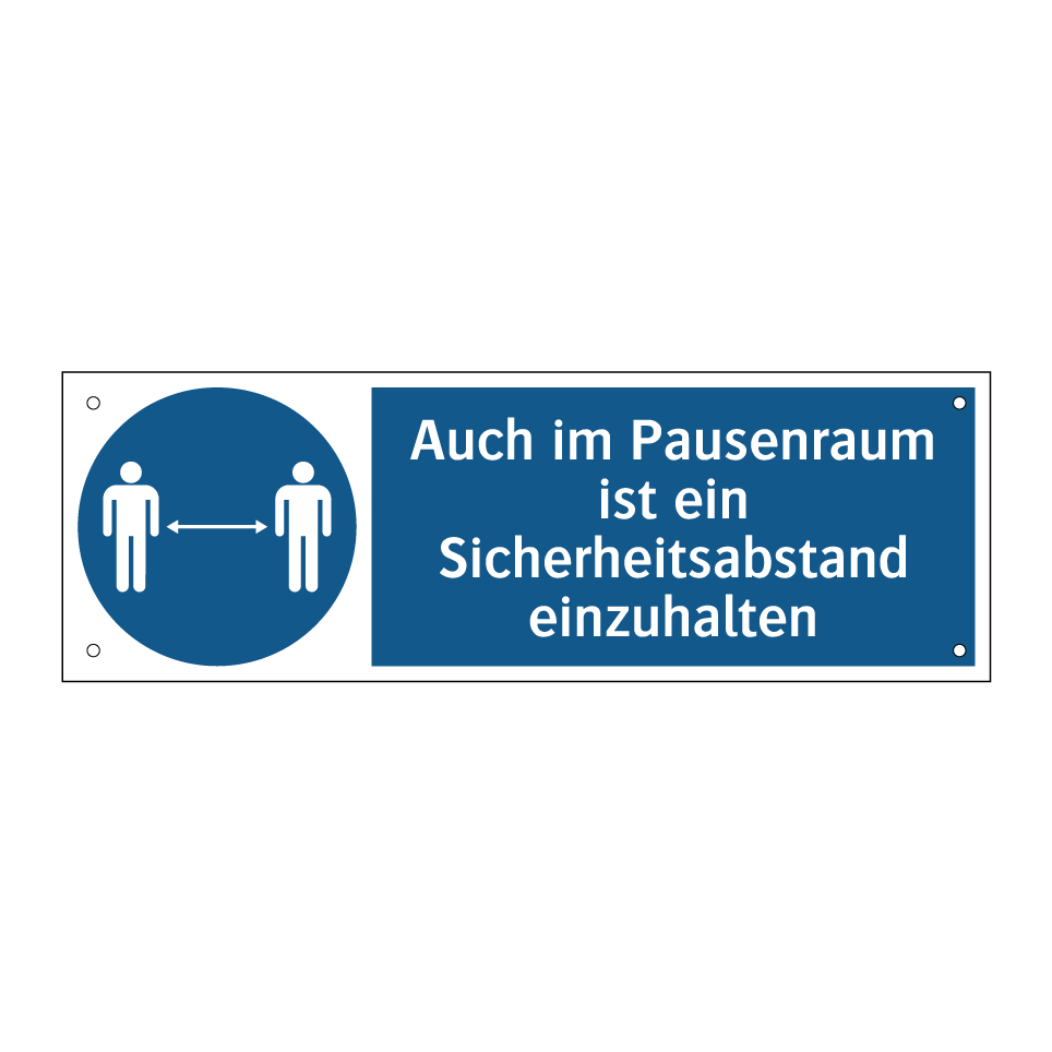 Gebotsschild mit dem Text Auch im Pausenraum ist ein Sicherheitsabstand einzuhalten