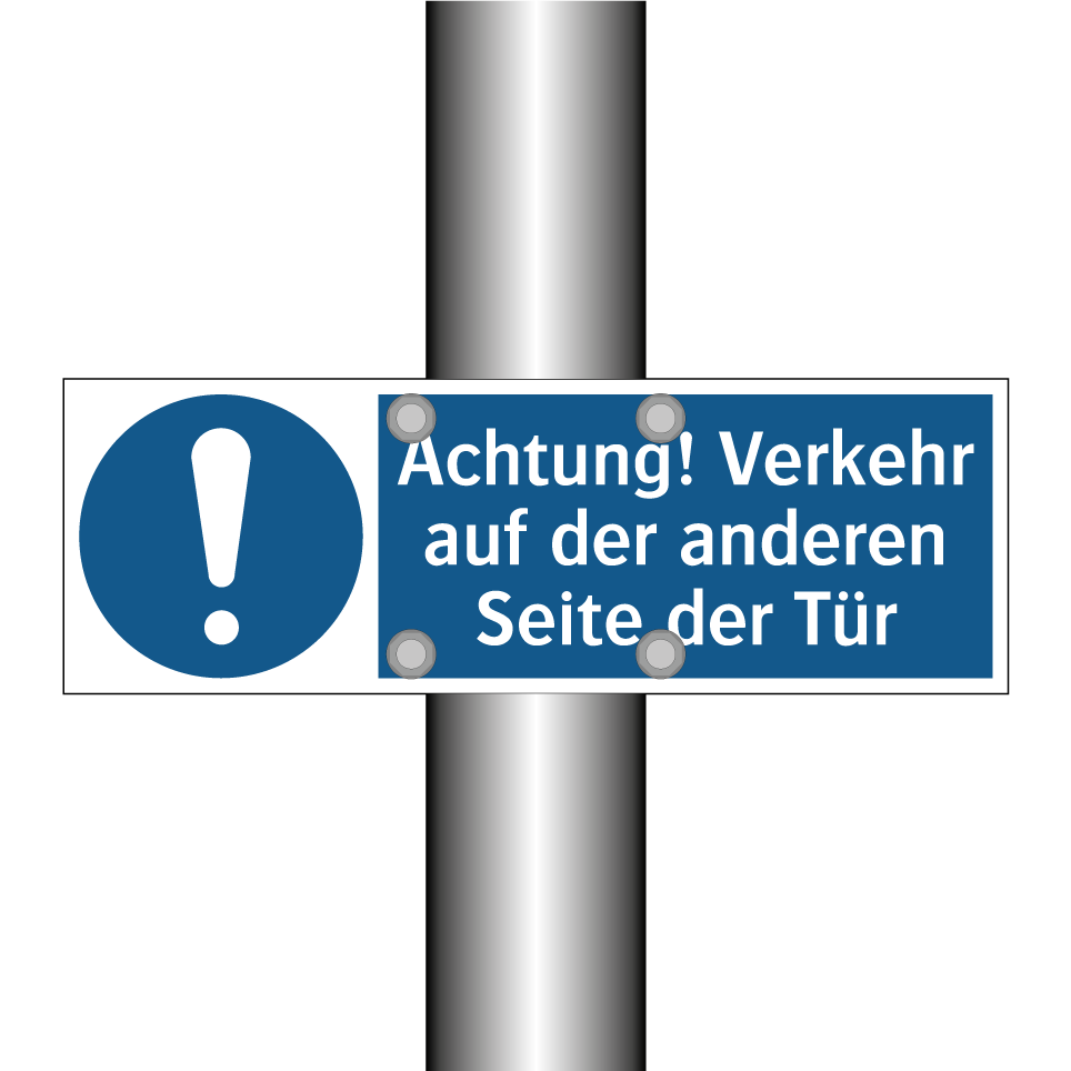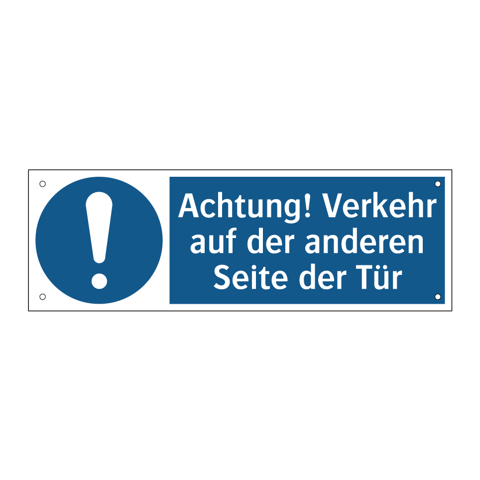 Gebotsschild mit dem Text Achtung! Verkehr auf der anderen Seite der Tür