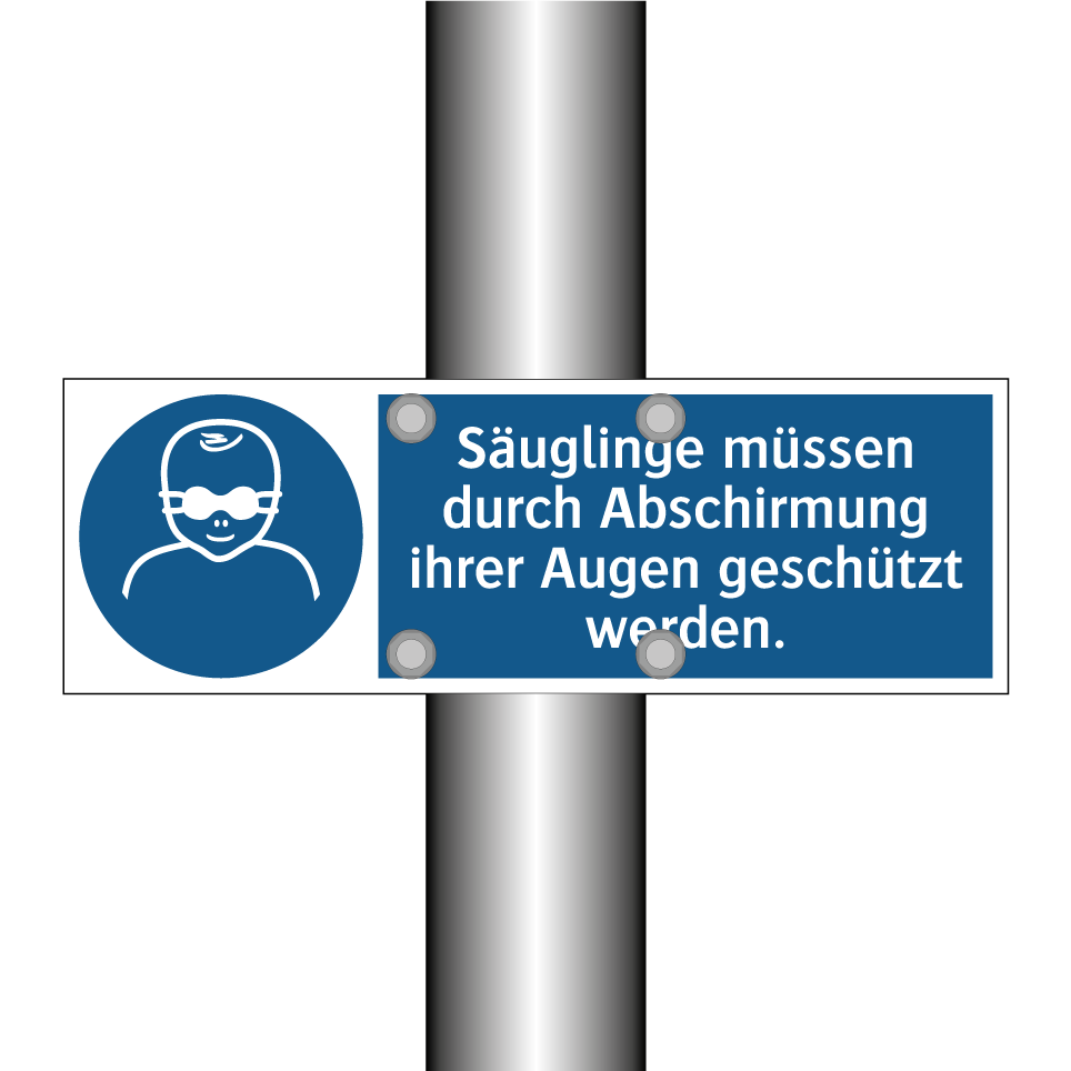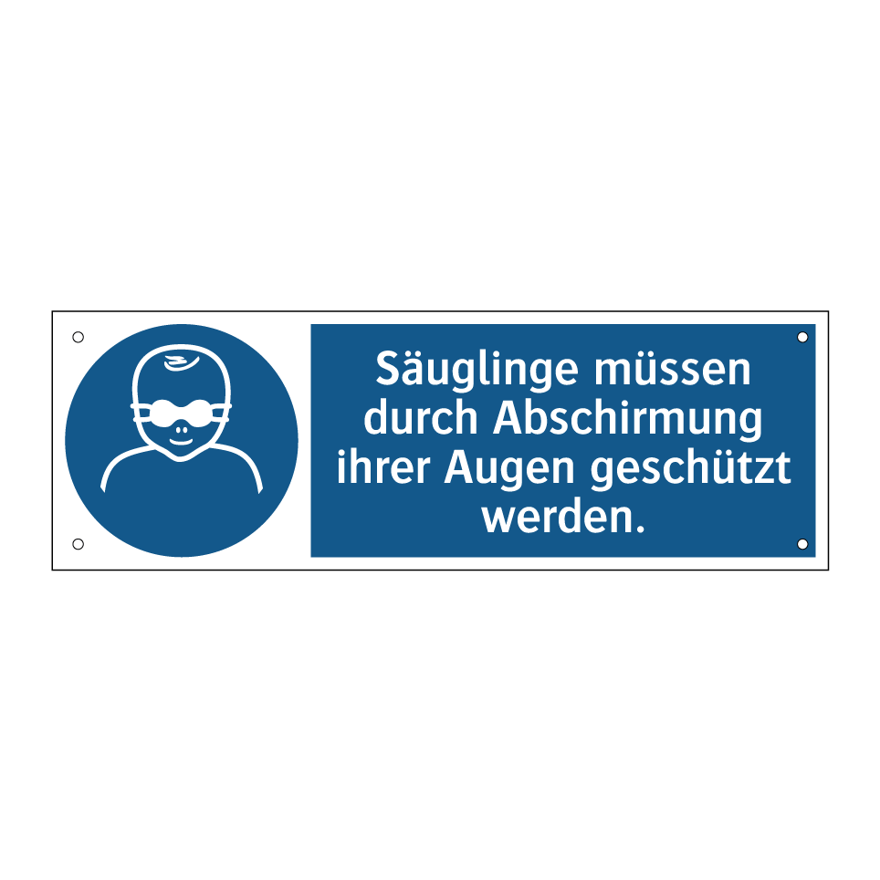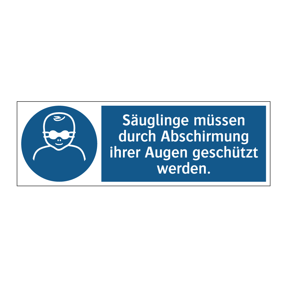 Gebotsschild mit dem Text Säuglinge müssen durch Abschirmung ihrer Augen geschützt werden.