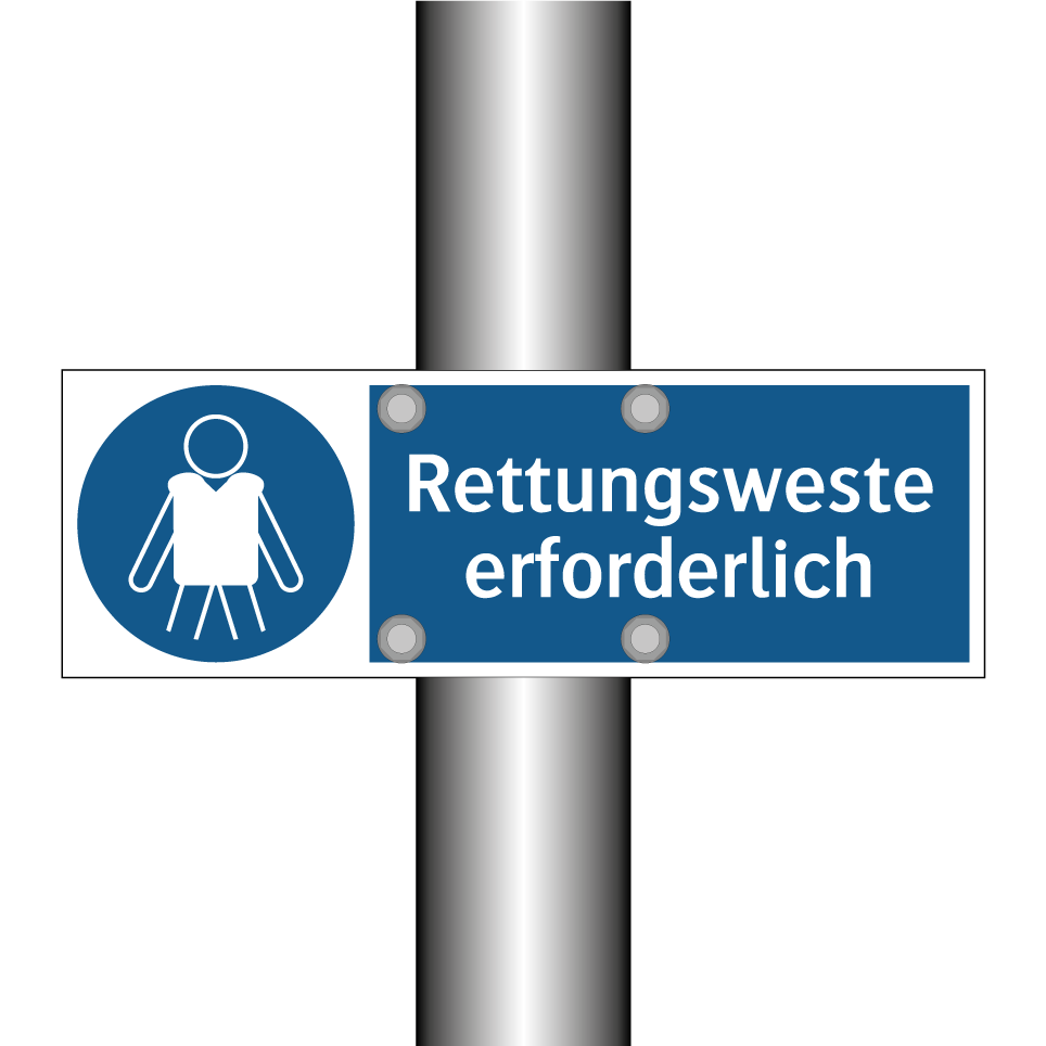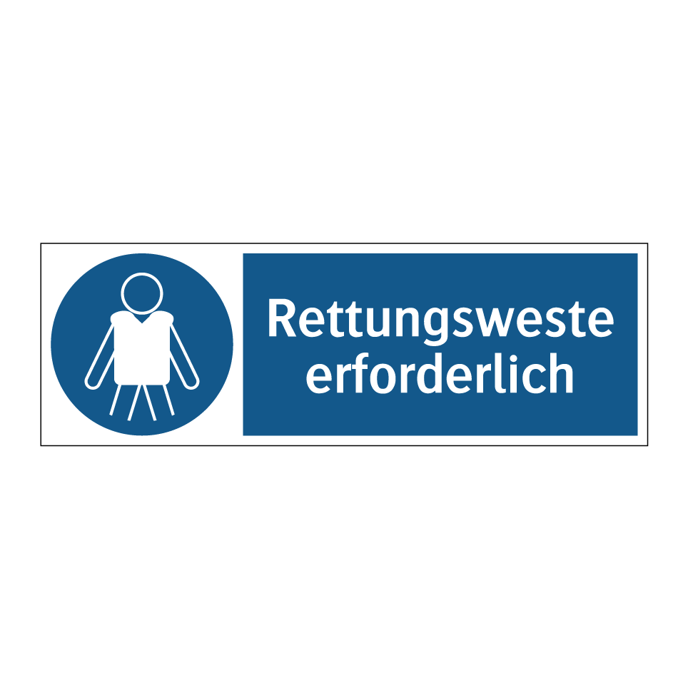 Gebotsschild mit dem Text Rettungsweste erforderlich