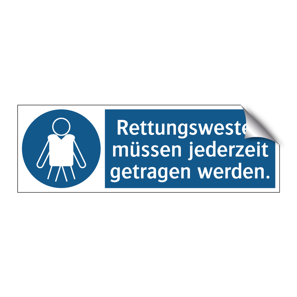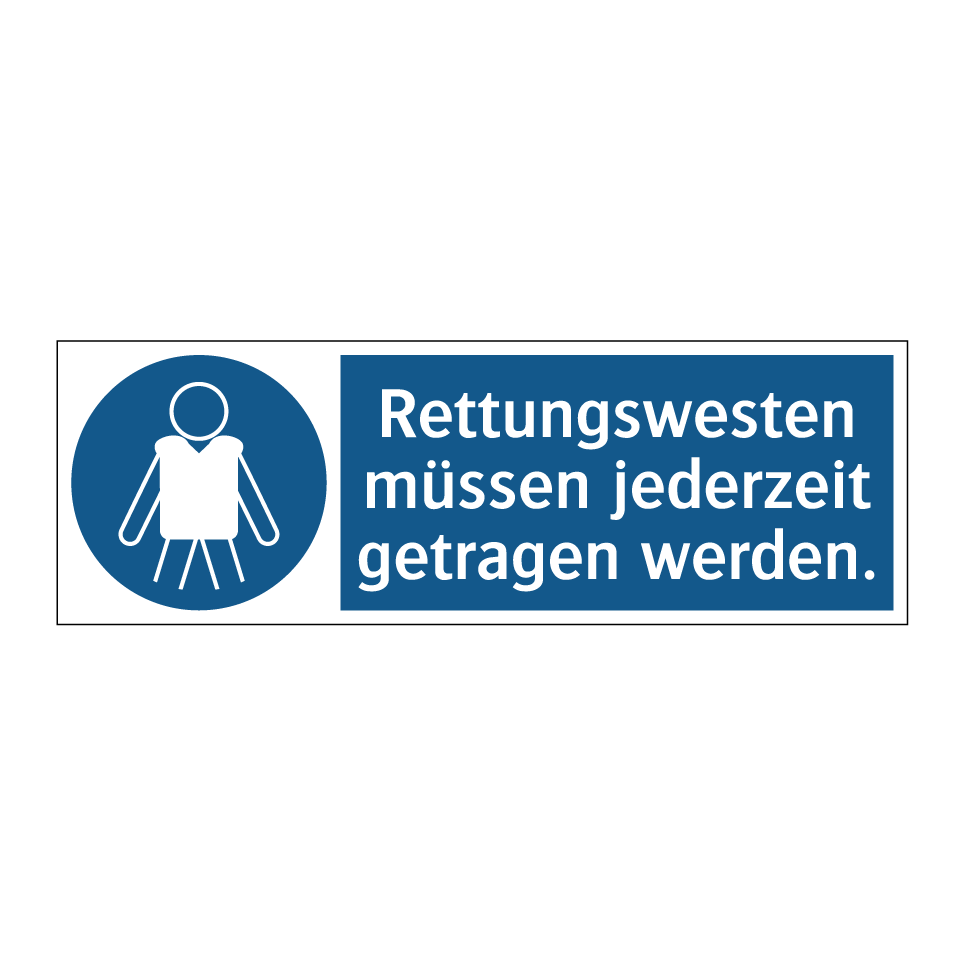 Gebotsschild mit dem Text Rettungswesten müssen jederzeit getragen werden.