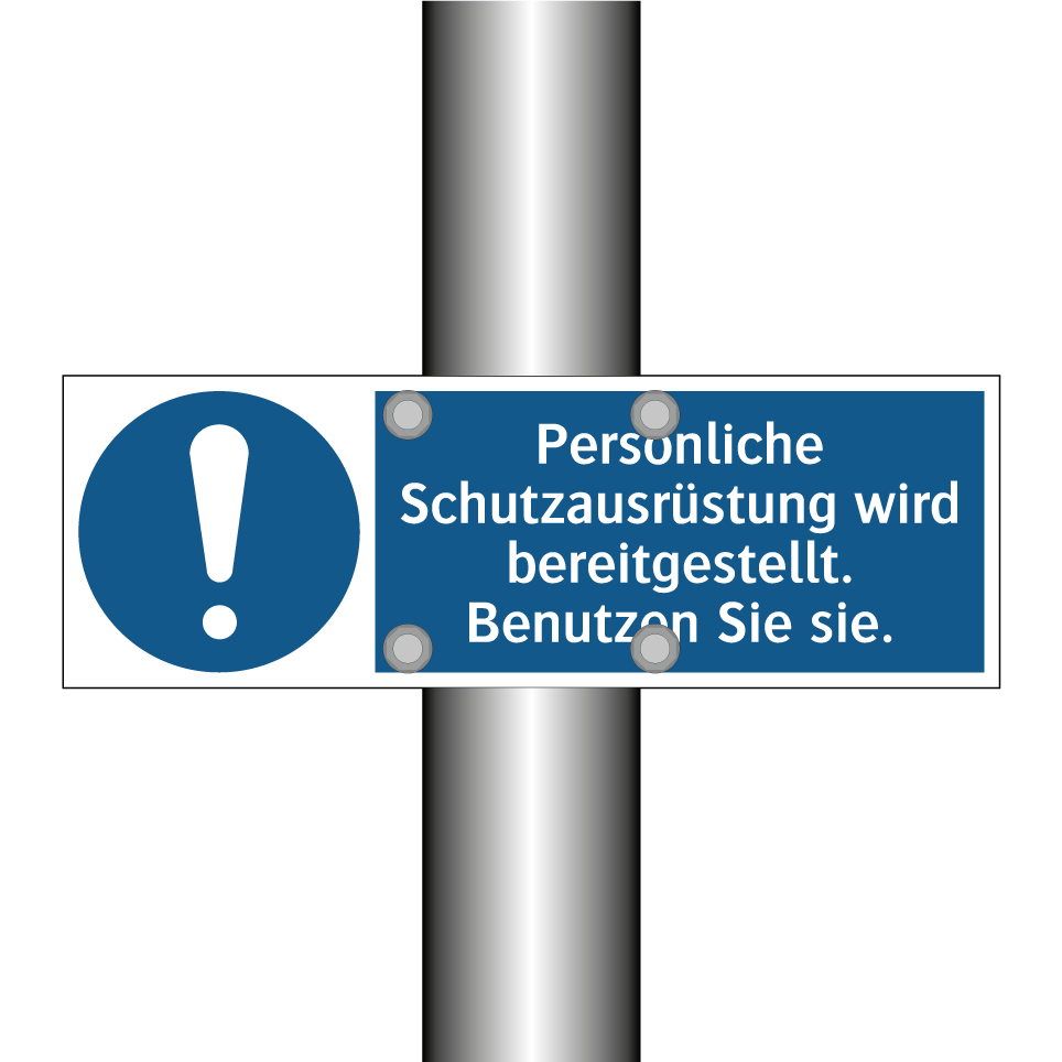 Gebotsschild mit dem Text Persönliche Schutzausrüstung wird bereitgestellt. Benutzen Sie sie.
