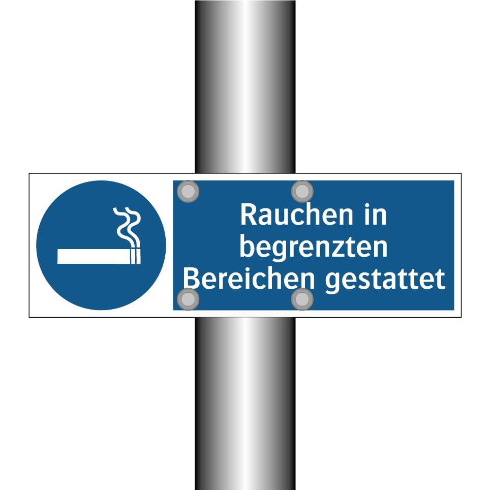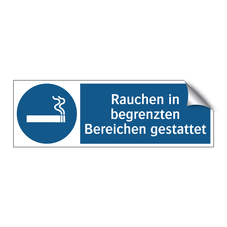 Gebotsschild mit dem Text Rauchen in begrenzten Bereichen gestattet