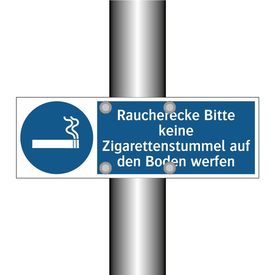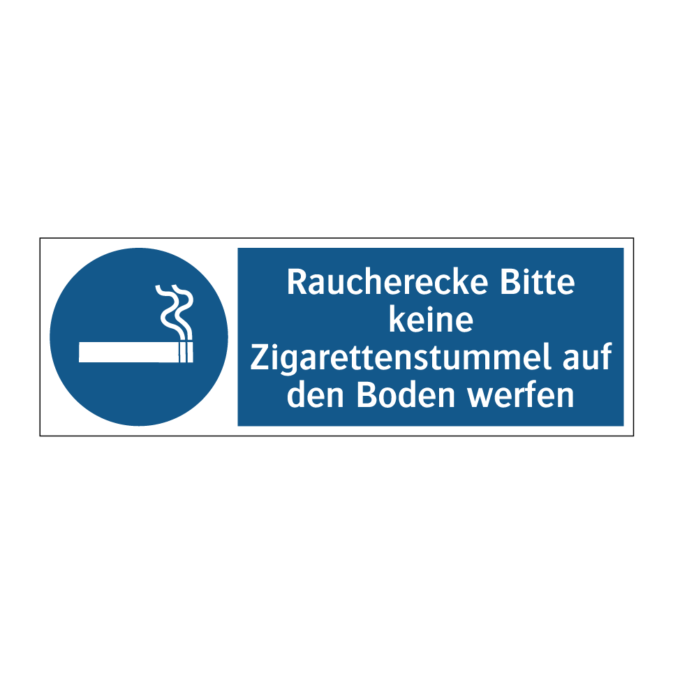 Gebotsschild mit dem Text Raucherecke Bitte keine Zigarettenstummel auf den Boden werfen