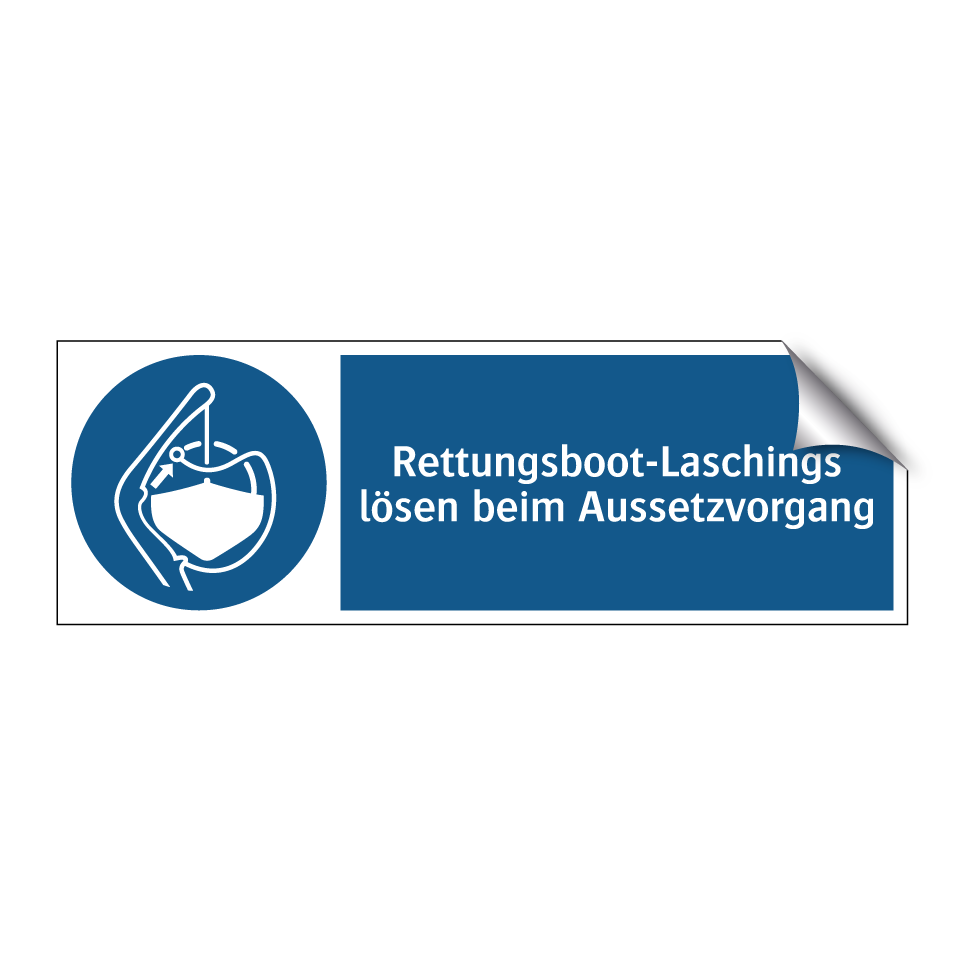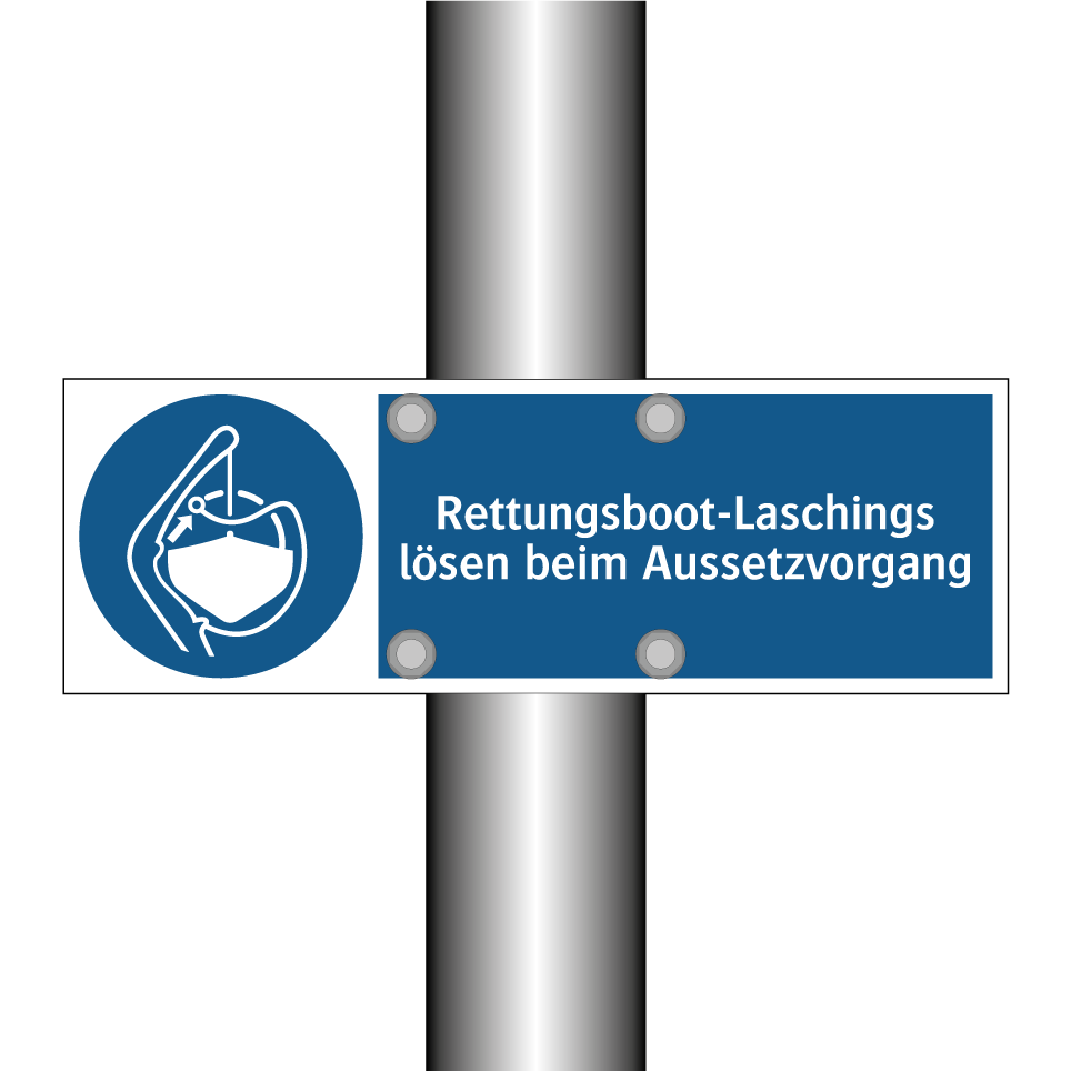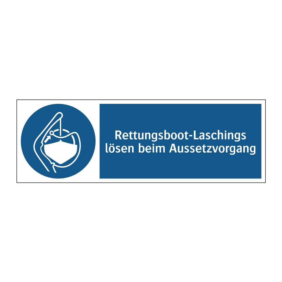 Gebotsschild mit dem Text Rettungsboot-Laschings lösen beim Aussetzvorgang