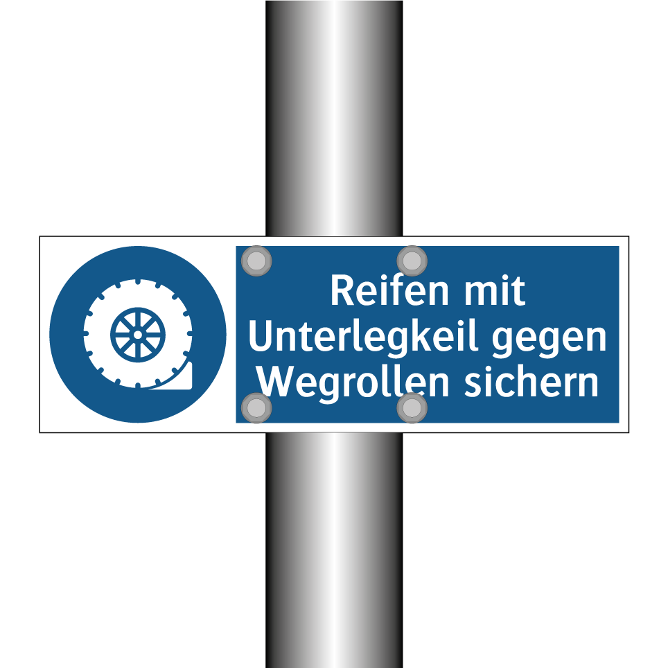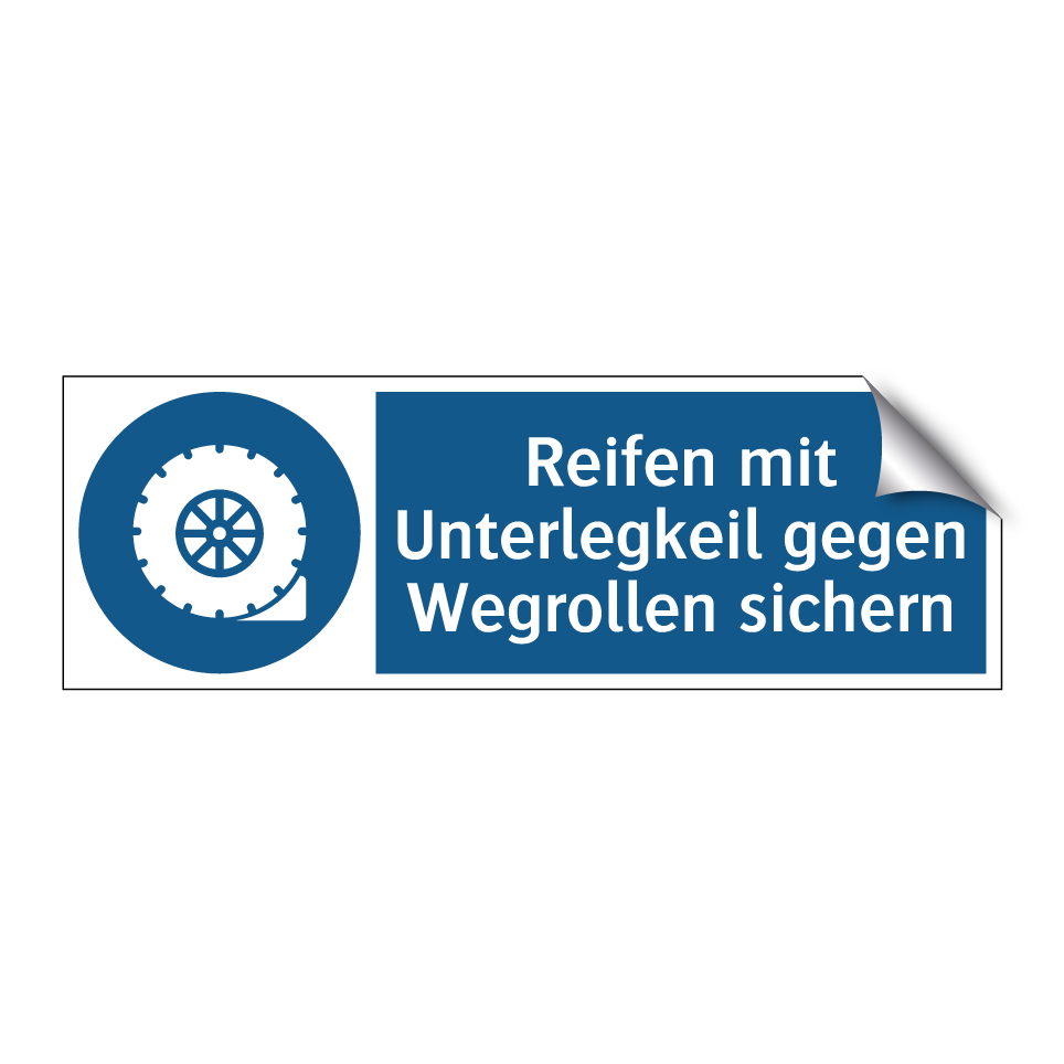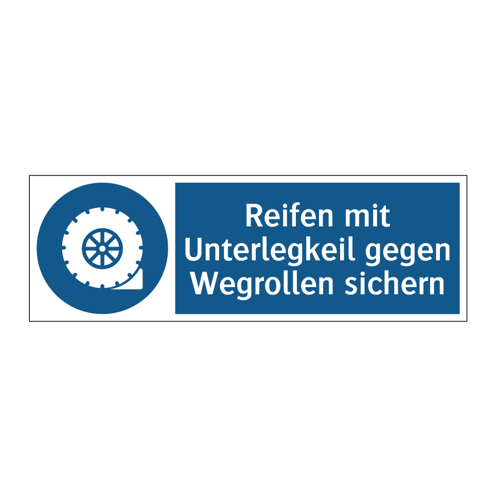 Gebotsschild mit dem Text Reifen mit Unterlegkeil gegen Wegrollen sichern