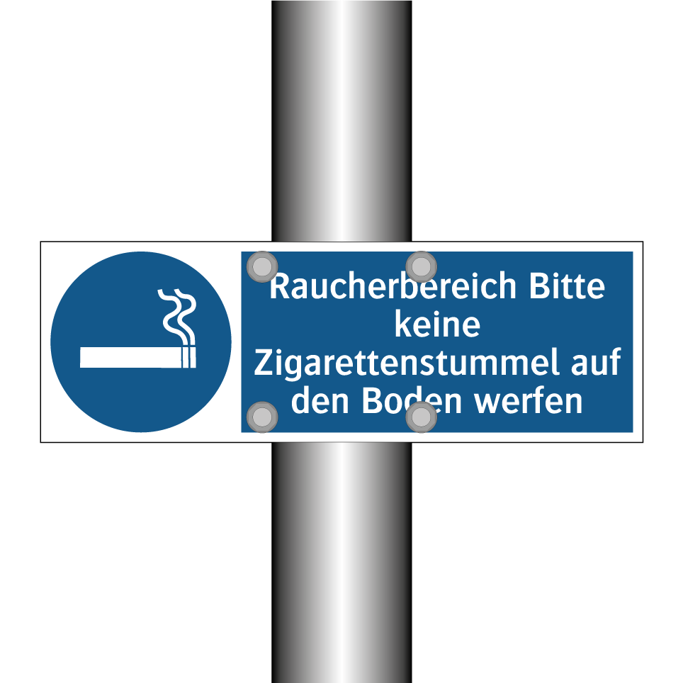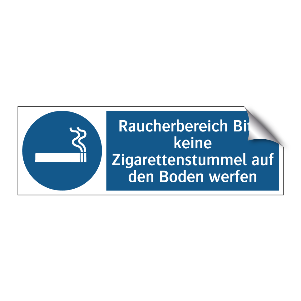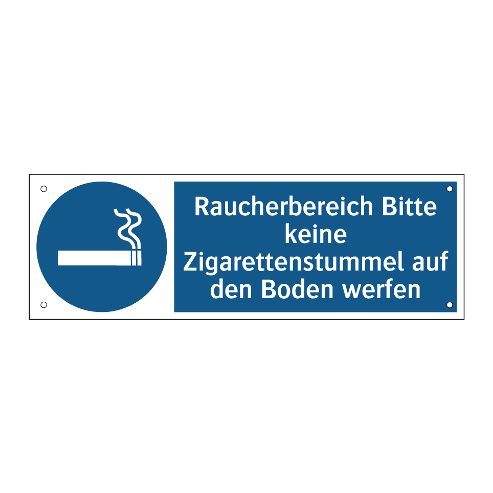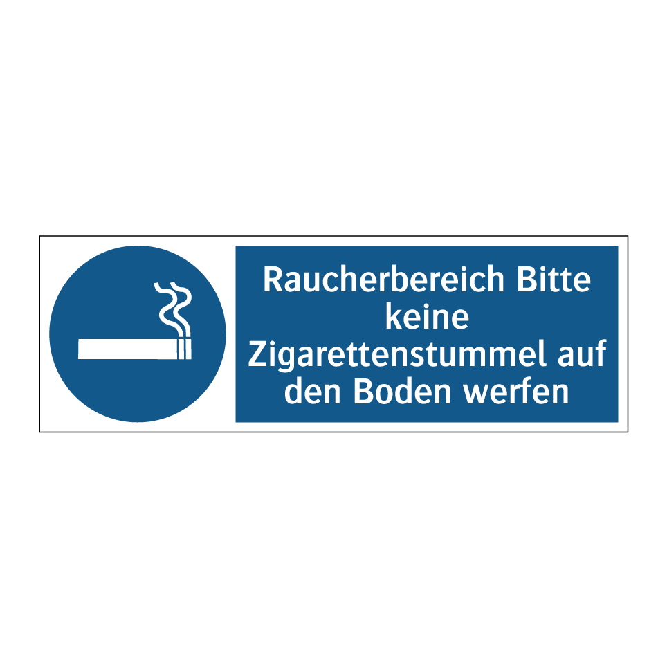 Gebotsschild mit dem Text Raucherbereich Bitte keine Zigarettenstummel auf den Boden werfen