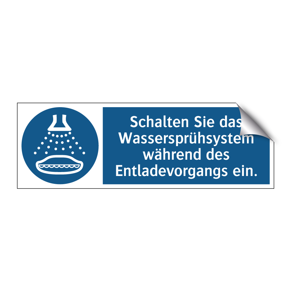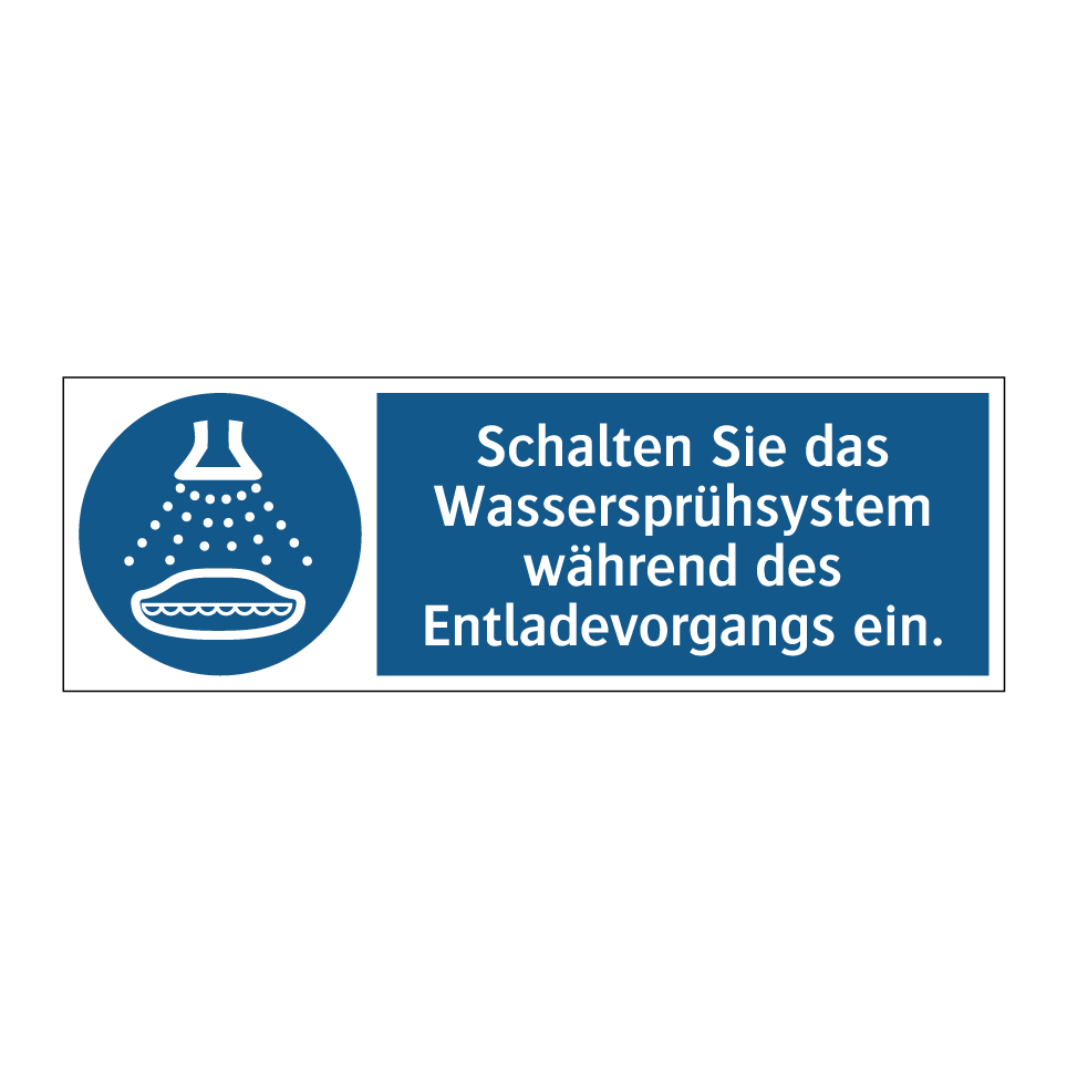 Gebotsschild mit dem Text Schalten Sie das Wassersprühsystem während des Entladevorgangs ein.