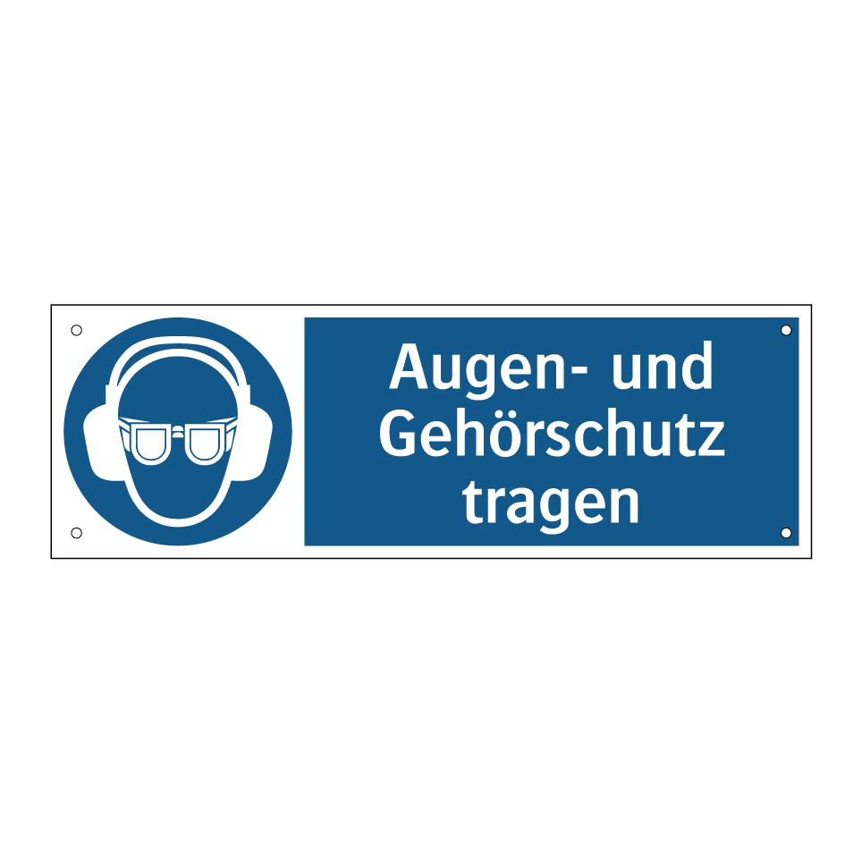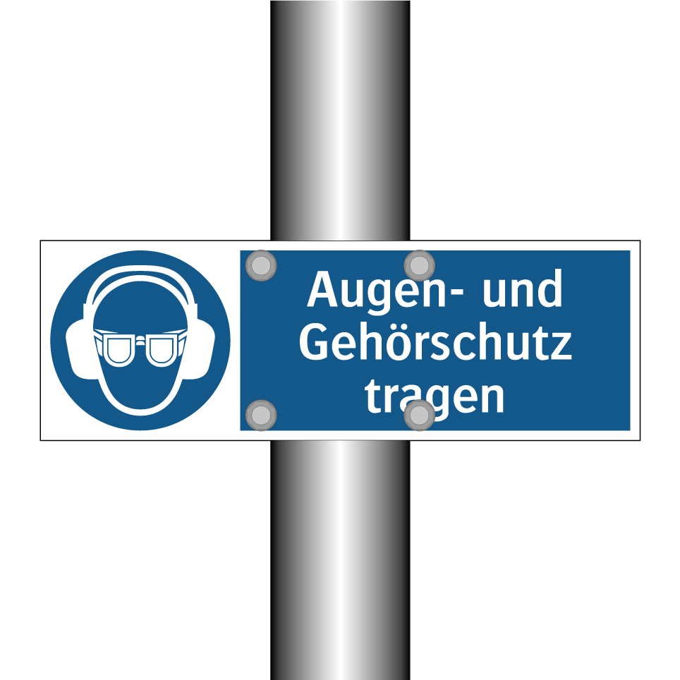 Gebotsschild mit dem Text Augen- und Gehörschutz tragen