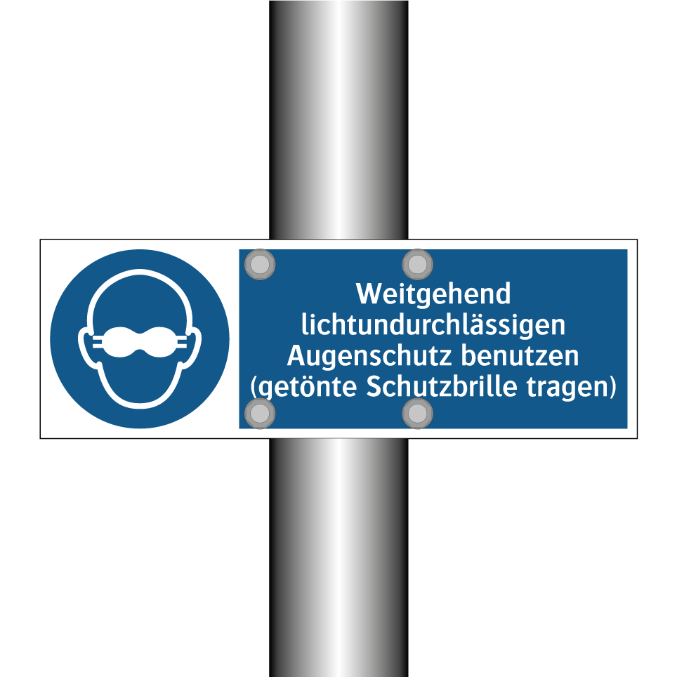 Gebotsschild mit dem Text Weitgehend lichtundurchlässigen Augenschutz benutzen (getönte Schutzbrille tragen)