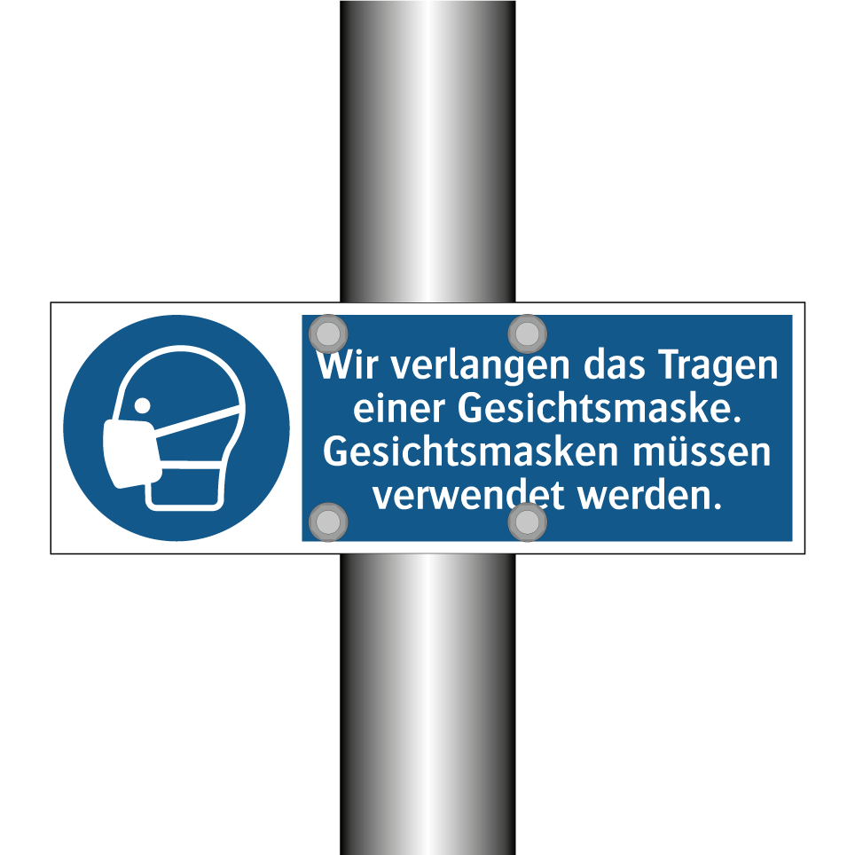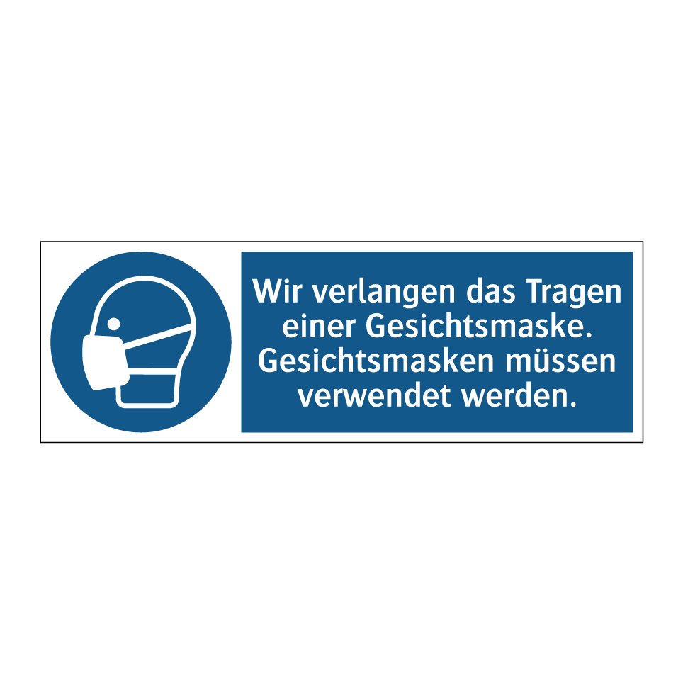 Gebotsschild mit dem Text Wir verlangen das Tragen einer Gesichtsmaske. Gesichtsmasken müssen verwendet werden.