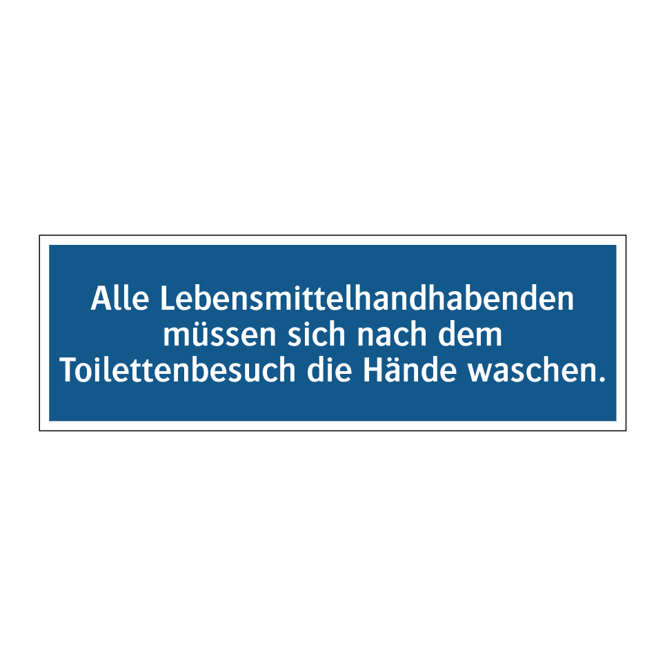 Diese Gebotsschild ist ein unverzichtbares Element für alle gastronomischen Betriebe und Lebensmittelverarbeitungsstätten. Sie erinnert daran, dass alle Mitarbeiter, die mit Lebensmitteln umgehen, nach dem Toilettengang ihre Hände waschen müssen. Diese wichtige Botschaft fördert die Hygiene und trägt zur Lebensmittelsicherheit bei. Ideal für die Platzierung in Toilettenbereichen von Restaurants, Cafés, Kantinen und anderen Einrichtungen, in denen Lebensmittel zubereitet oder serviert werden. Durch die klare blaue Hintergrundfarbe und den weißen Text ist die Anweisung leicht erkennbar und verständlich. Diese Gebotsschild unterstützt die Einhaltung von Hygienestandards und schützt sowohl Mitarbeiter als auch Kunden.