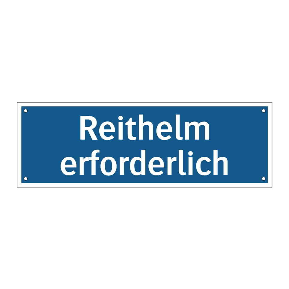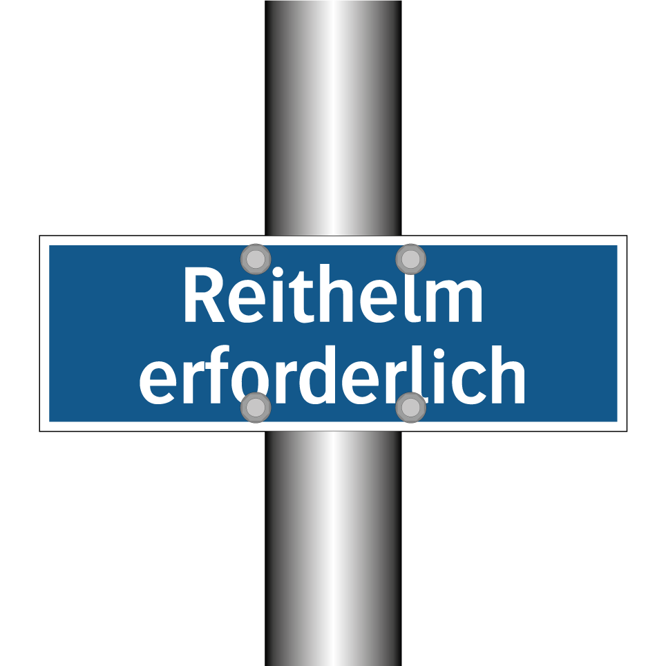 Diese Gebotsschild ist ein unverzichtbares Element für Reitställe und Reitschulen, um die Sicherheit der Reiter zu gewährleisten. Mit ihrer klaren blauen Hintergrundfarbe und der deutlichen weißen Schrift signalisiert sie unmissverständlich die Notwendigkeit, einen Reithelm zu tragen. Diese Sicherheitsmaßnahme ist besonders wichtig in Bereichen, in denen Reitunterricht stattfindet oder Pferde gemietet werden können. Die Gebotsschild kann strategisch an Eingängen zu Reitplätzen, in Umkleideräumen oder in der Nähe von Stallungen platziert werden, um sicherzustellen, dass alle Reiter auf die Helmpflicht aufmerksam gemacht werden. Sie dient als ständige Erinnerung an die Bedeutung des Schutzes und der Vorsicht beim Reiten.