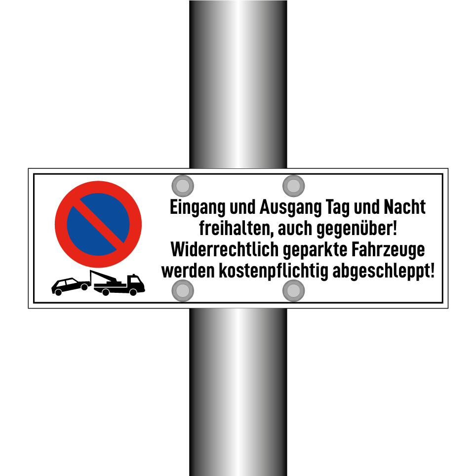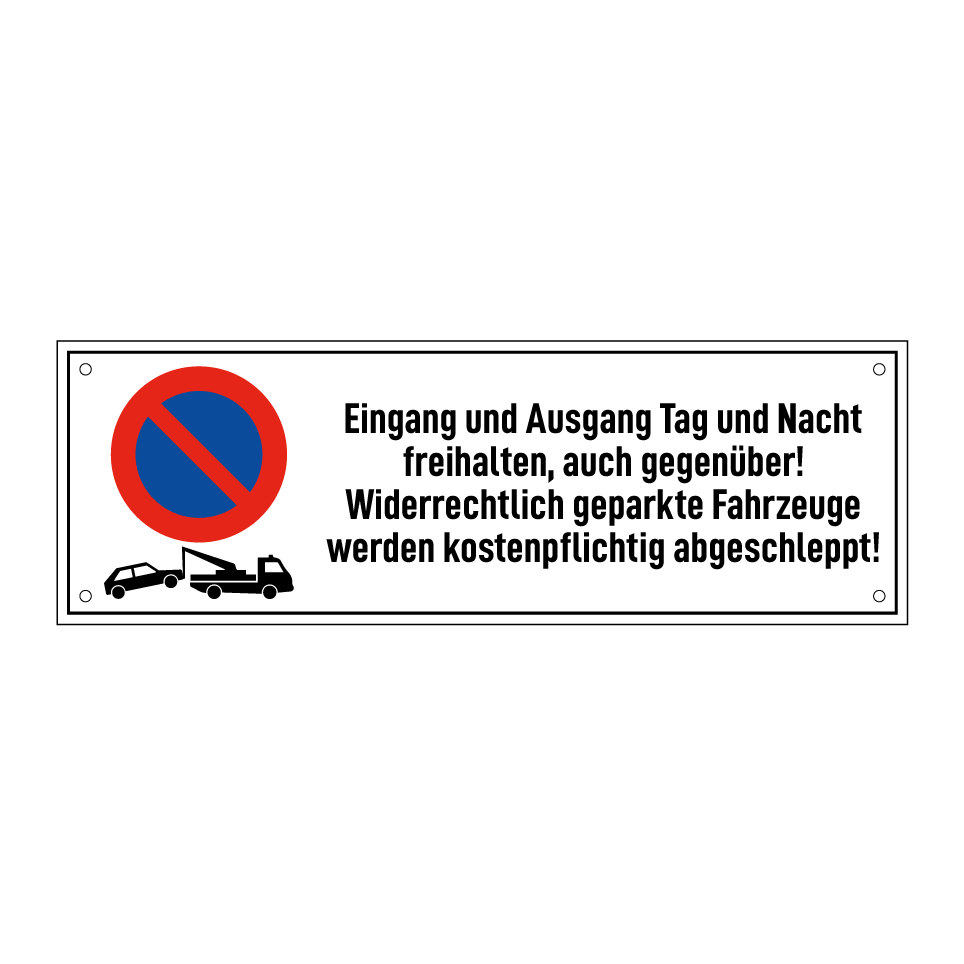 Eingang und Ausgang Tag und Nacht freihalten, auch gegenüber! Widerrechtlich geparkte Fahrzeuge werden kostenpflichtig abgeschleppt!