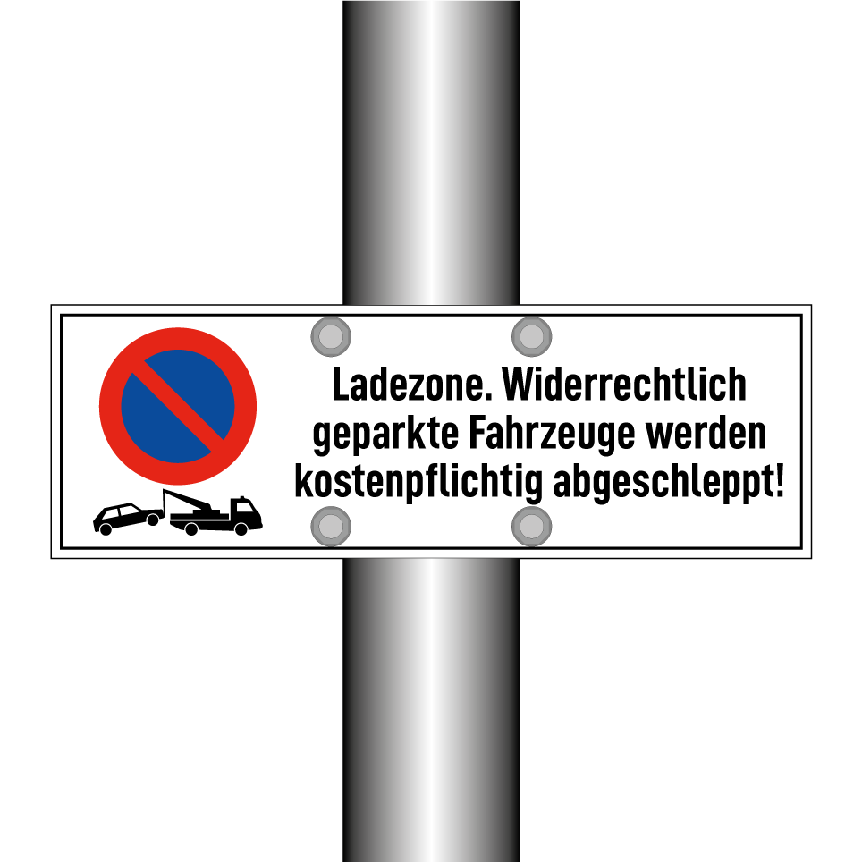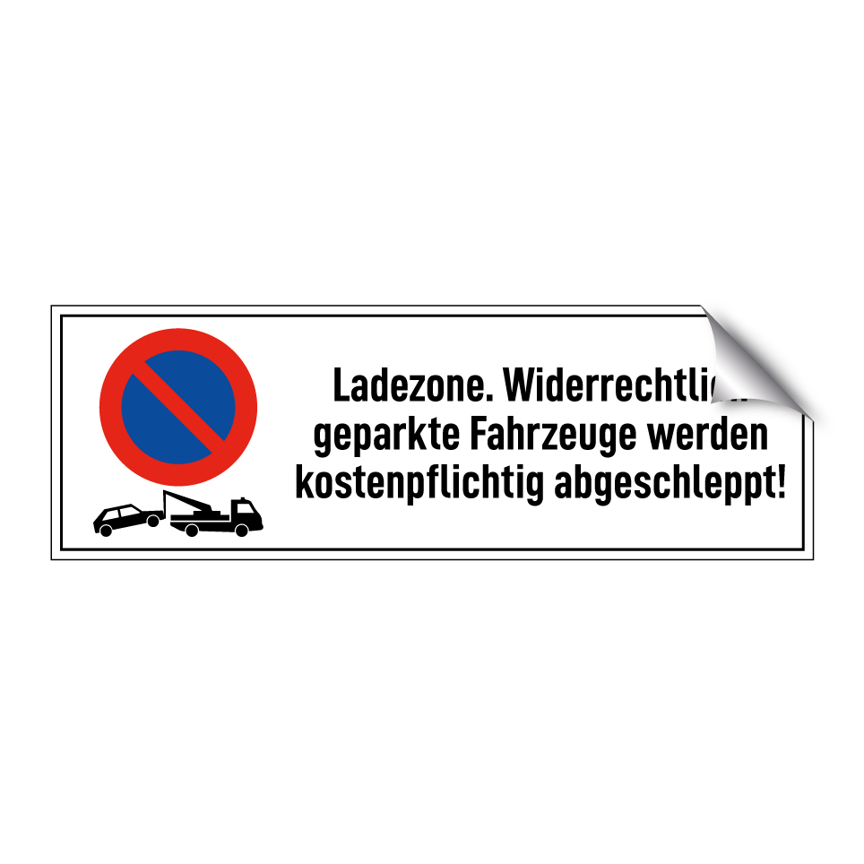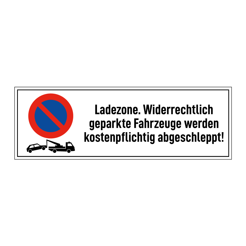 Ladezone. Widerrechtlich geparkte Fahrzeuge werden kostenpflichtig abgeschleppt!