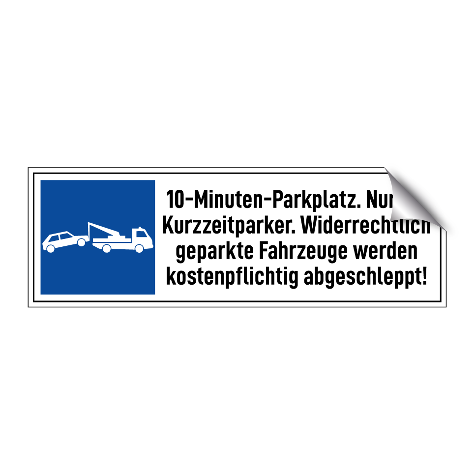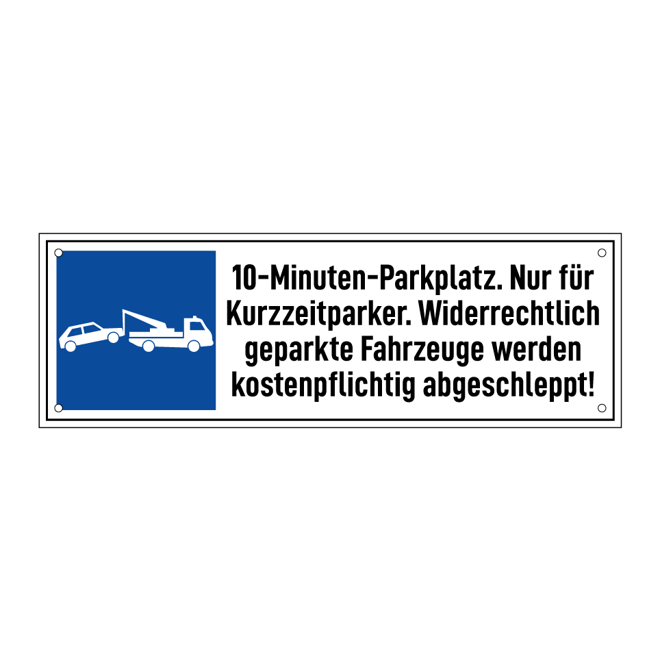 10-Minuten-Parkplatz. Nur für Kurzzeitparker. Widerrechtlich geparkte Fahrzeuge werden kostenpflichtig abgeschleppt!