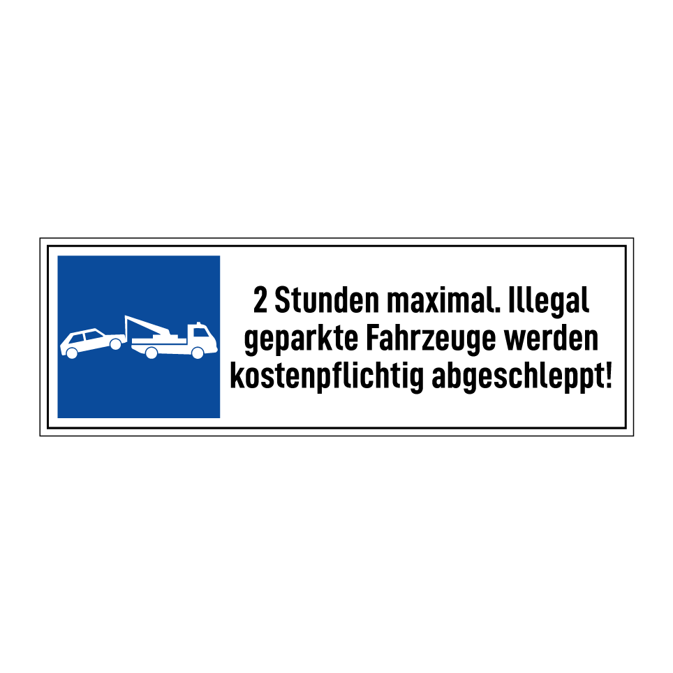 2 Stunden maximal. Illegal geparkte Fahrzeuge werden kostenpflichtig abgeschleppt!