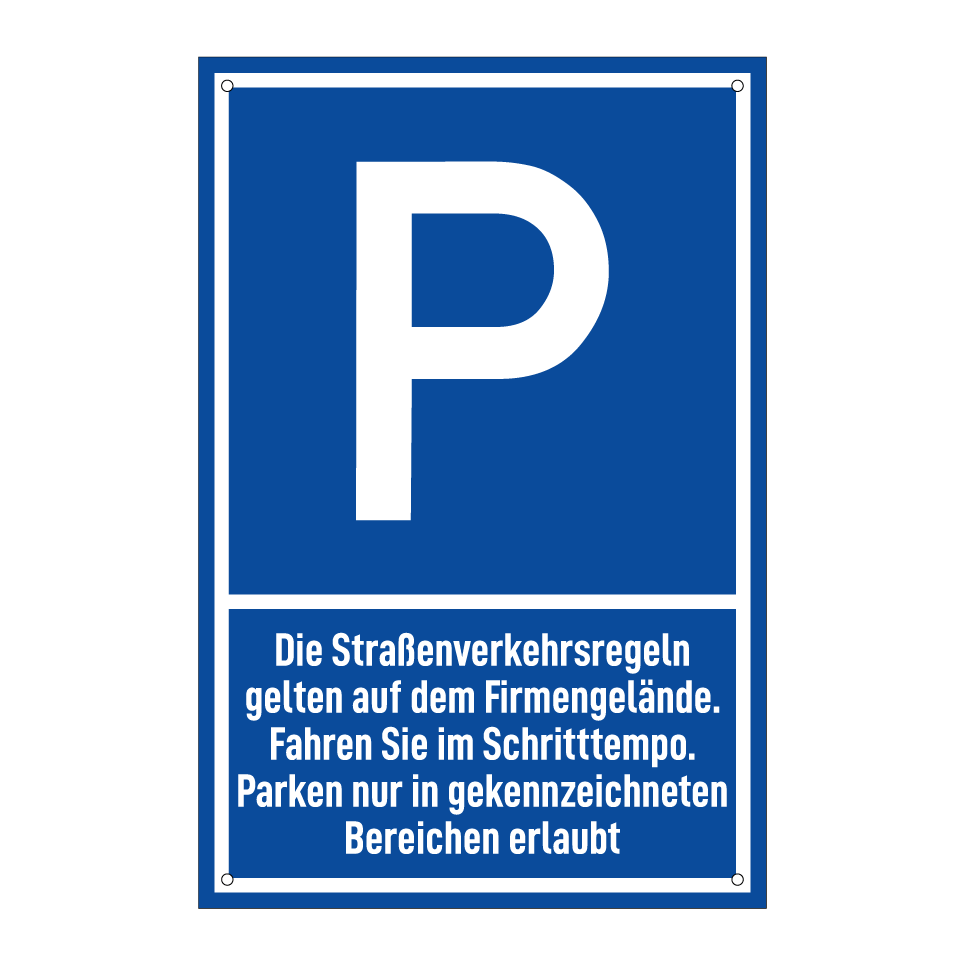 Die Straßenverkehrsregeln gelten auf dem Firmengelände. Fahren Sie im Schritttempo. Parken nur in gekennzeichneten Bereichen erlaubt