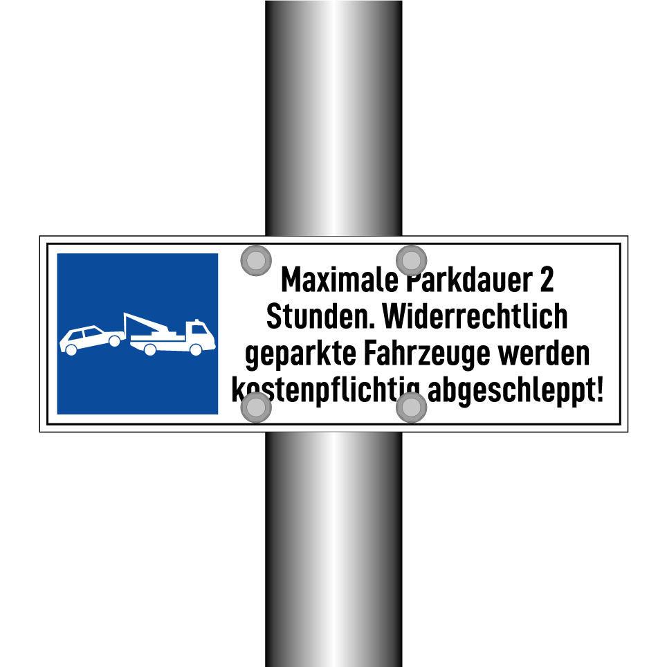 Maximale Parkdauer 2 Stunden. Widerrechtlich geparkte Fahrzeuge werden kostenpflichtig abgeschleppt!