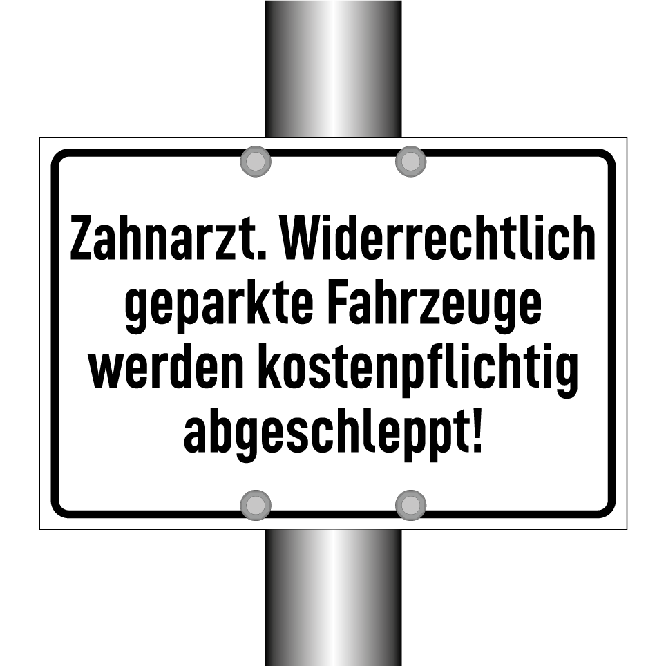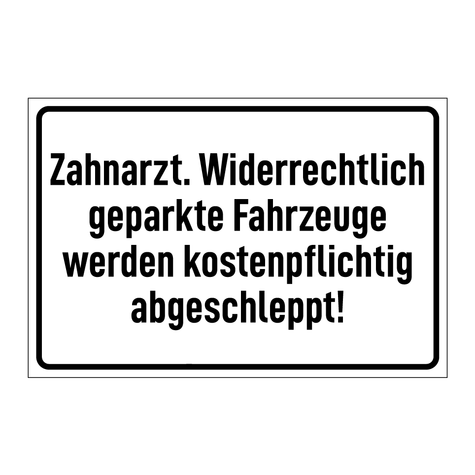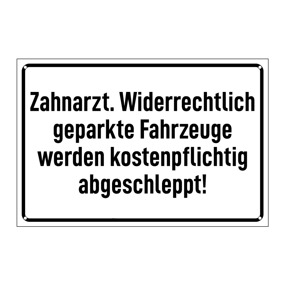 Zahnarzt. Widerrechtlich geparkte Fahrzeuge werden kostenpflichtig abgeschleppt!