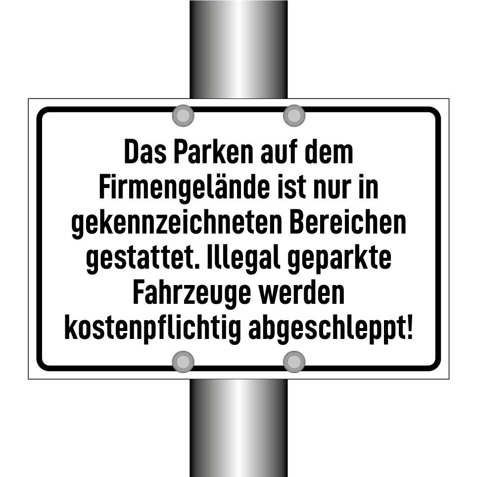 Das Parken auf dem Firmengelände ist nur in gekennzeichneten Bereichen gestattet. Illegal geparkte Fahrzeuge werden kostenpflichtig abgeschleppt!