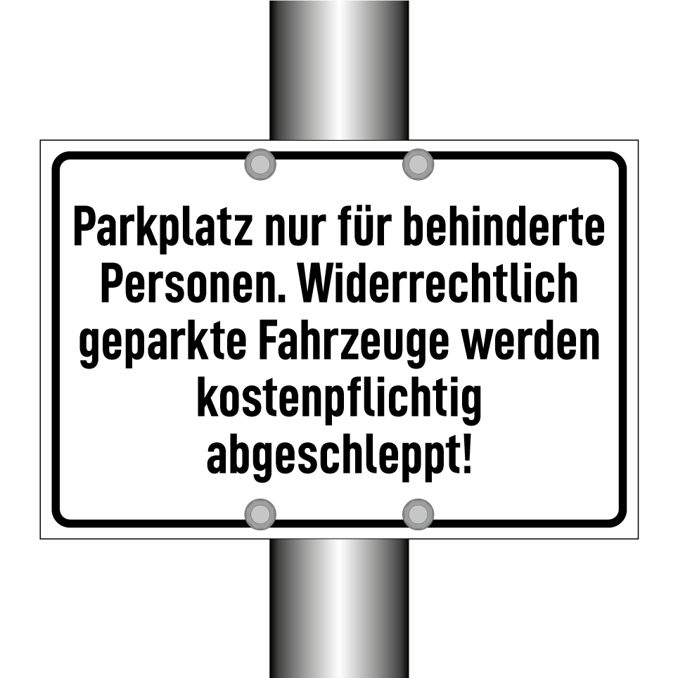 Parkplatz nur für behinderte Personen. Widerrechtlich geparkte Fahrzeuge werden kostenpflichtig abgeschleppt!
