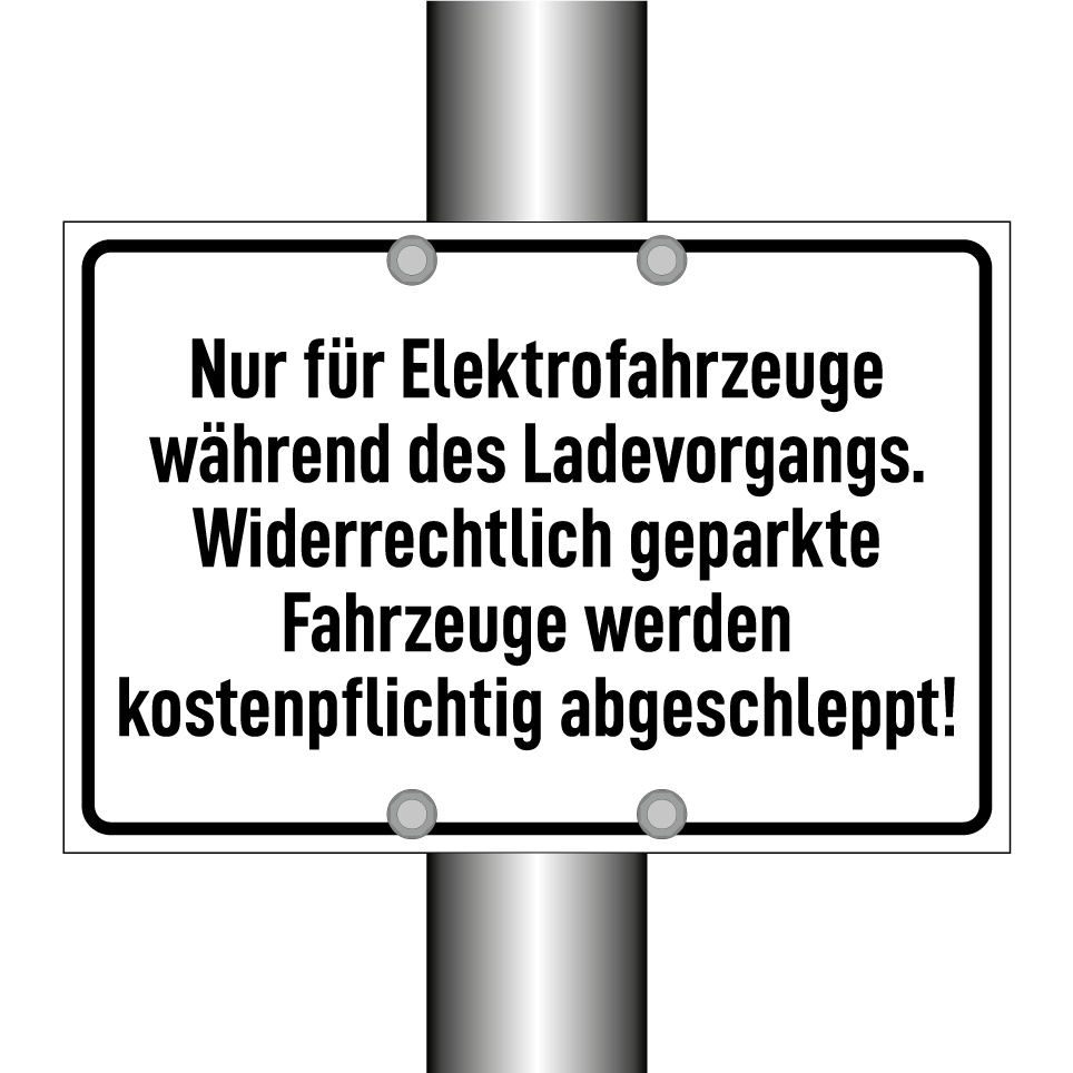 Nur für Elektrofahrzeuge während des Ladevorgangs. Widerrechtlich geparkte Fahrzeuge werden kostenpflichtig abgeschleppt!