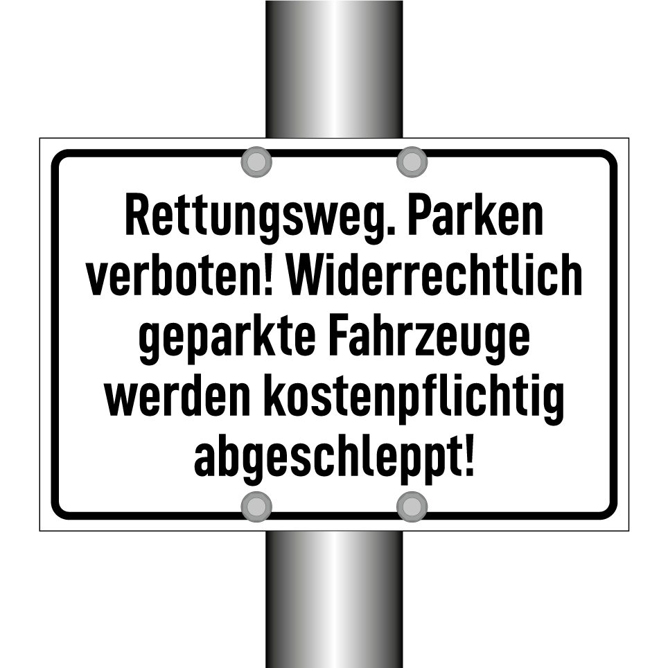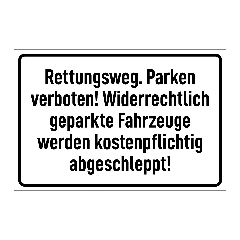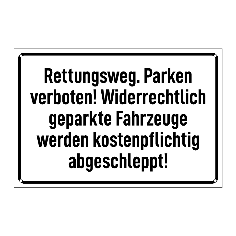 Rettungsweg. Parken verboten! Widerrechtlich geparkte Fahrzeuge werden kostenpflichtig abgeschleppt!