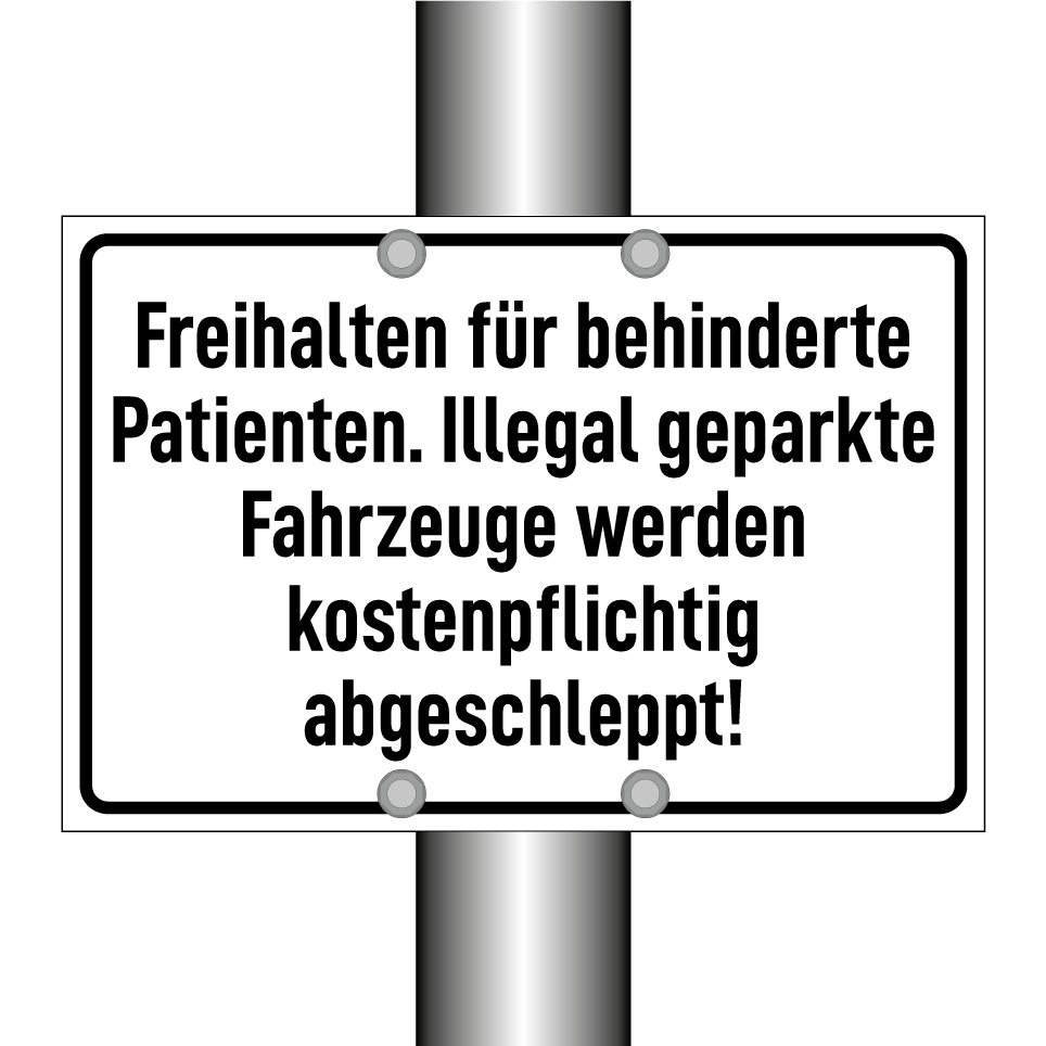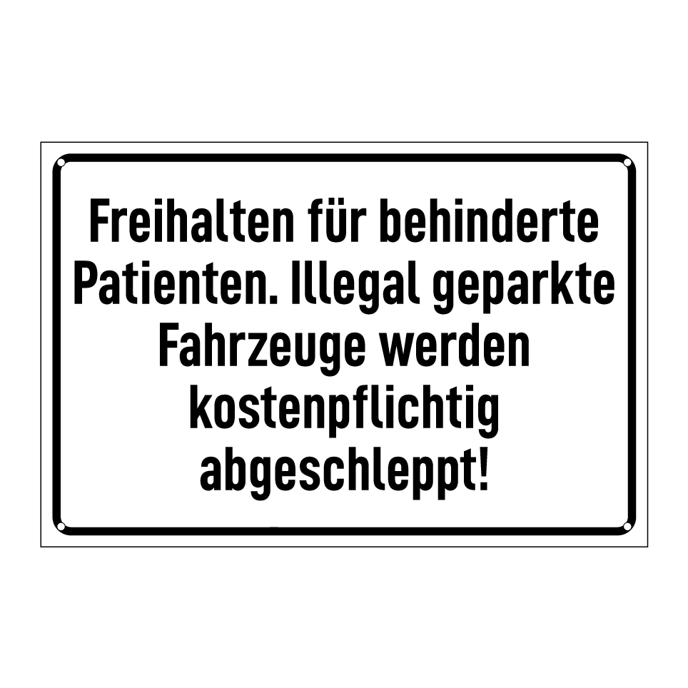 Freihalten für behinderte Patienten. Illegal geparkte Fahrzeuge werden kostenpflichtig abgeschleppt!
