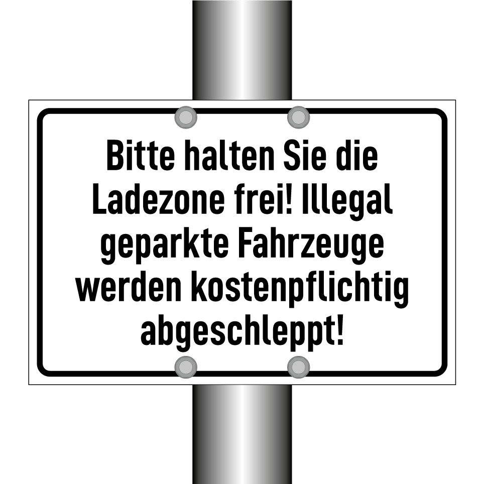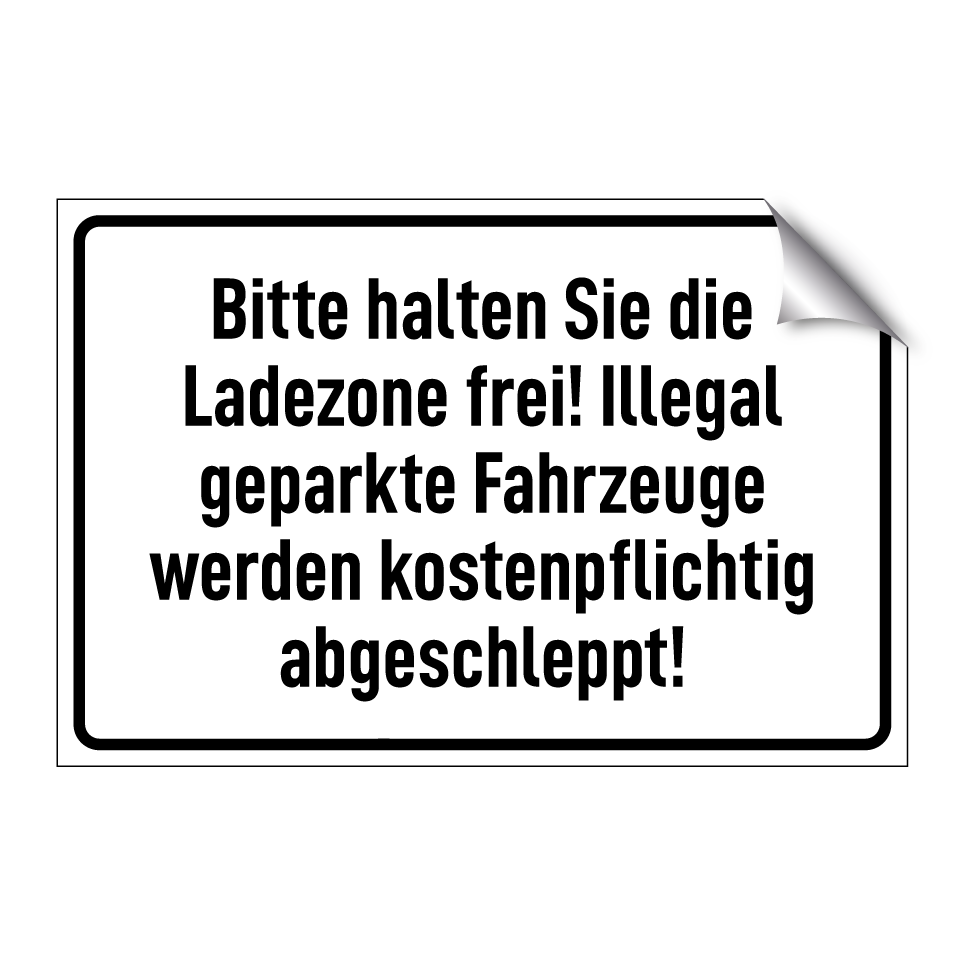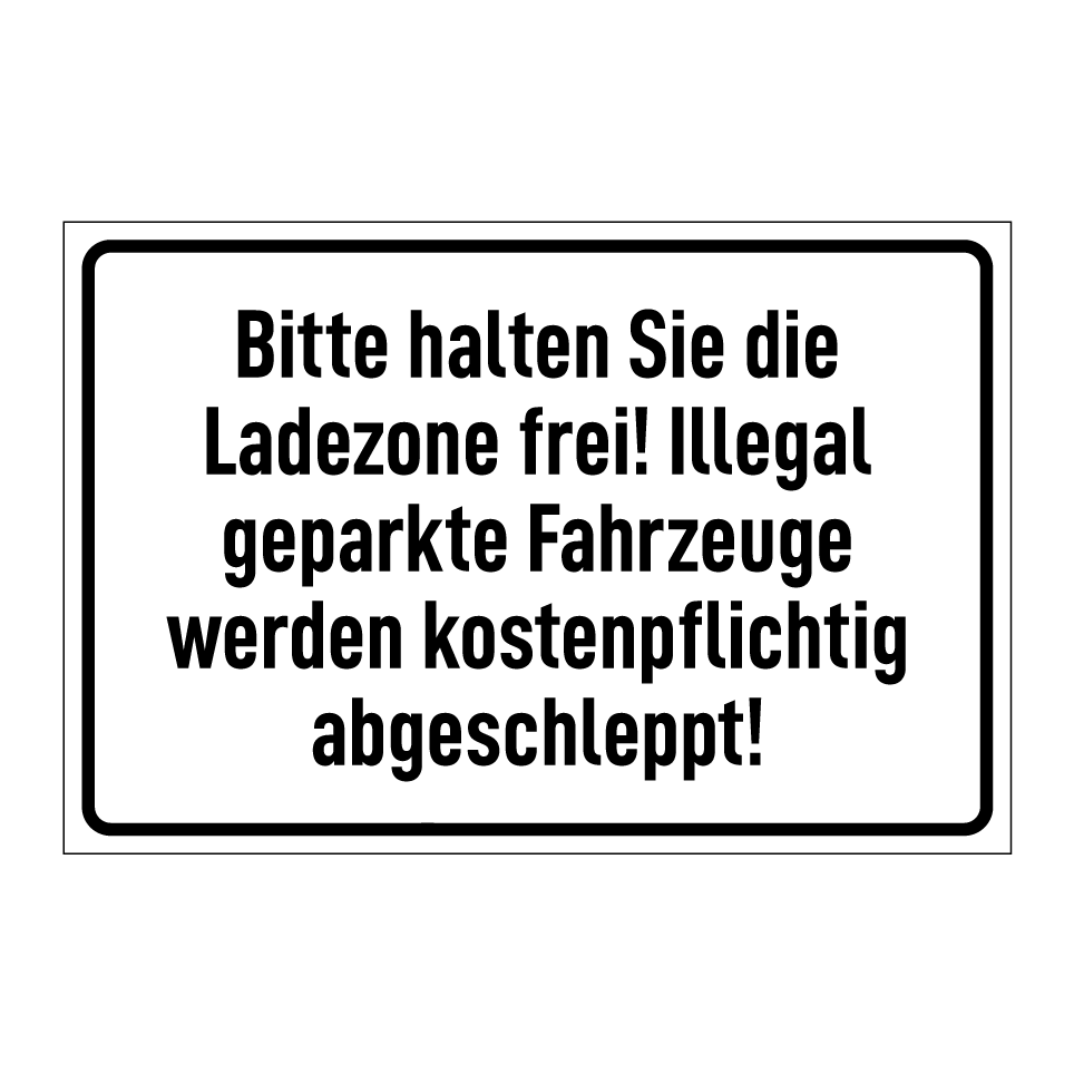 Bitte halten Sie die Ladezone frei! Illegal geparkte Fahrzeuge werden kostenpflichtig abgeschleppt!
