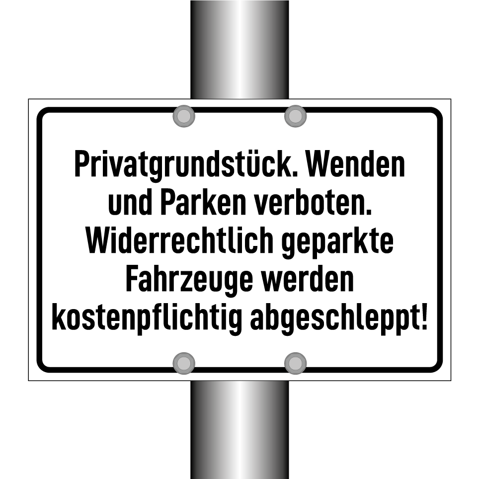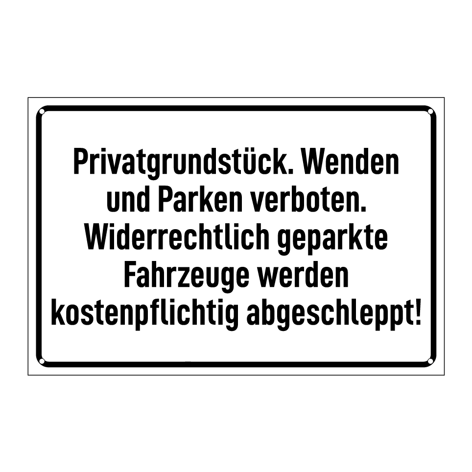 Privatgrundstück. Wenden und Parken verboten. Widerrechtlich geparkte Fahrzeuge werden kostenpflichtig abgeschleppt!