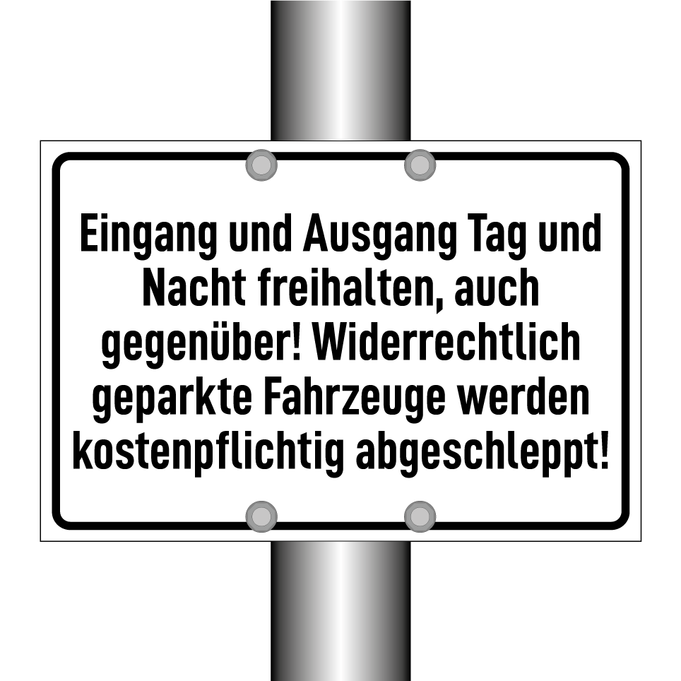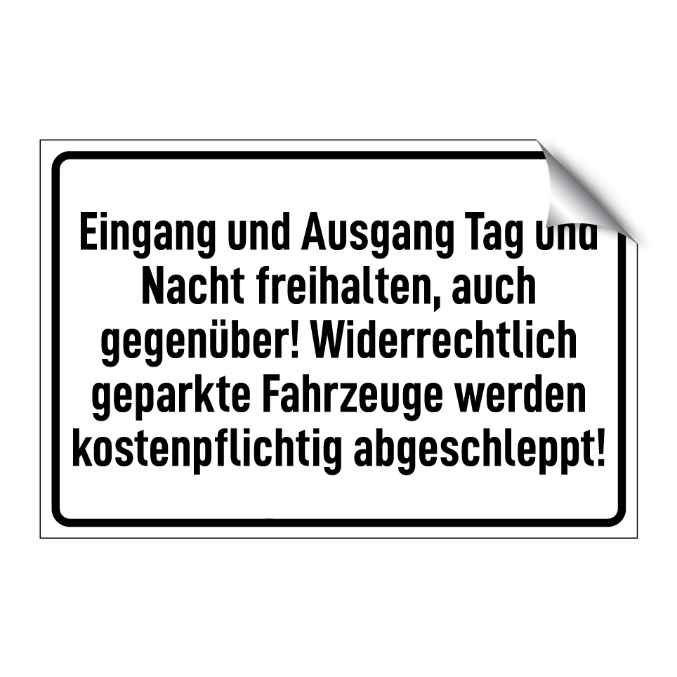 Eingang und Ausgang Tag und Nacht freihalten, auch gegenüber! Widerrechtlich geparkte Fahrzeuge werden kostenpflichtig abgeschleppt!