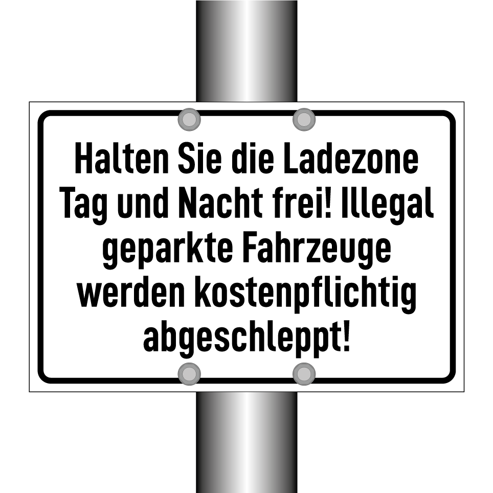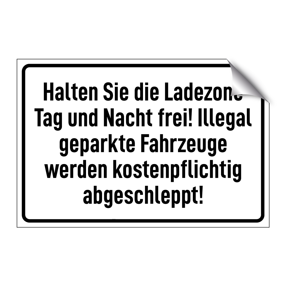 Halten Sie die Ladezone Tag und Nacht frei! Illegal geparkte Fahrzeuge werden kostenpflichtig abgeschleppt!