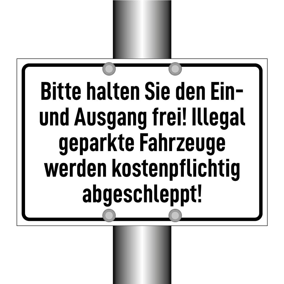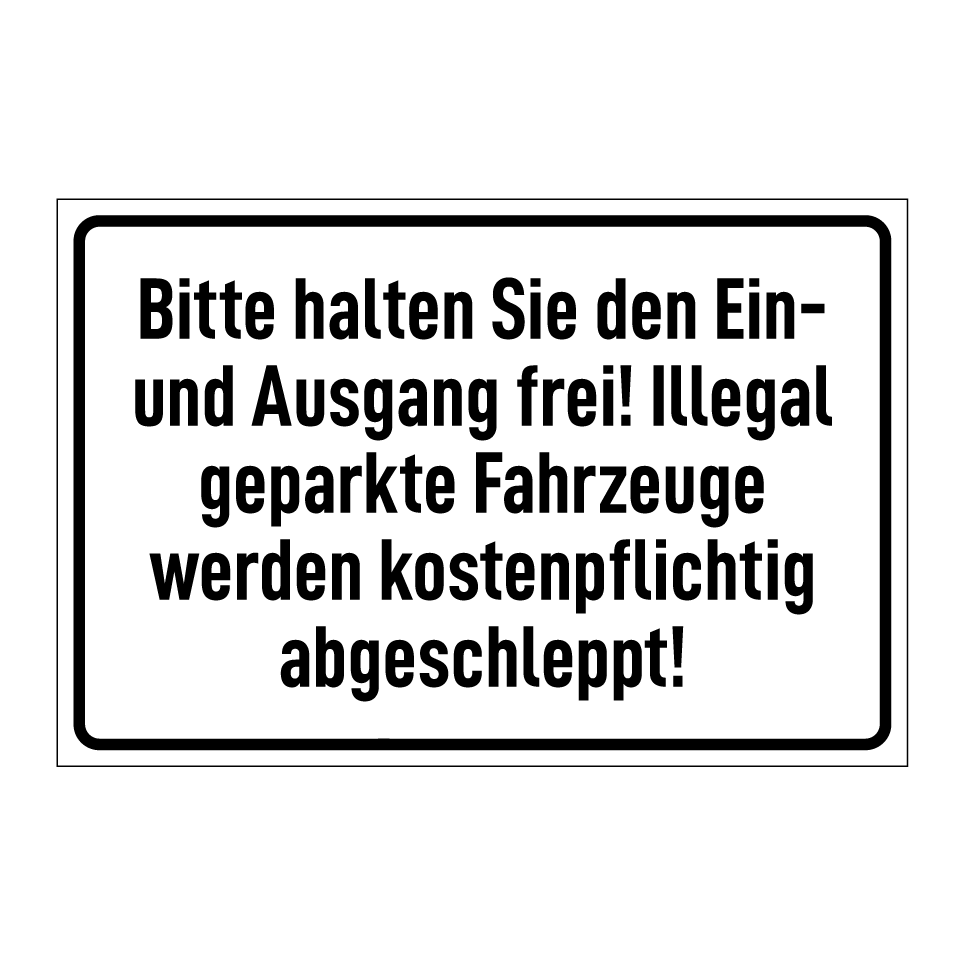Bitte halten Sie den Ein- und Ausgang frei! Illegal geparkte Fahrzeuge werden kostenpflichtig abgeschleppt!