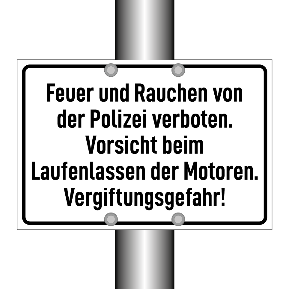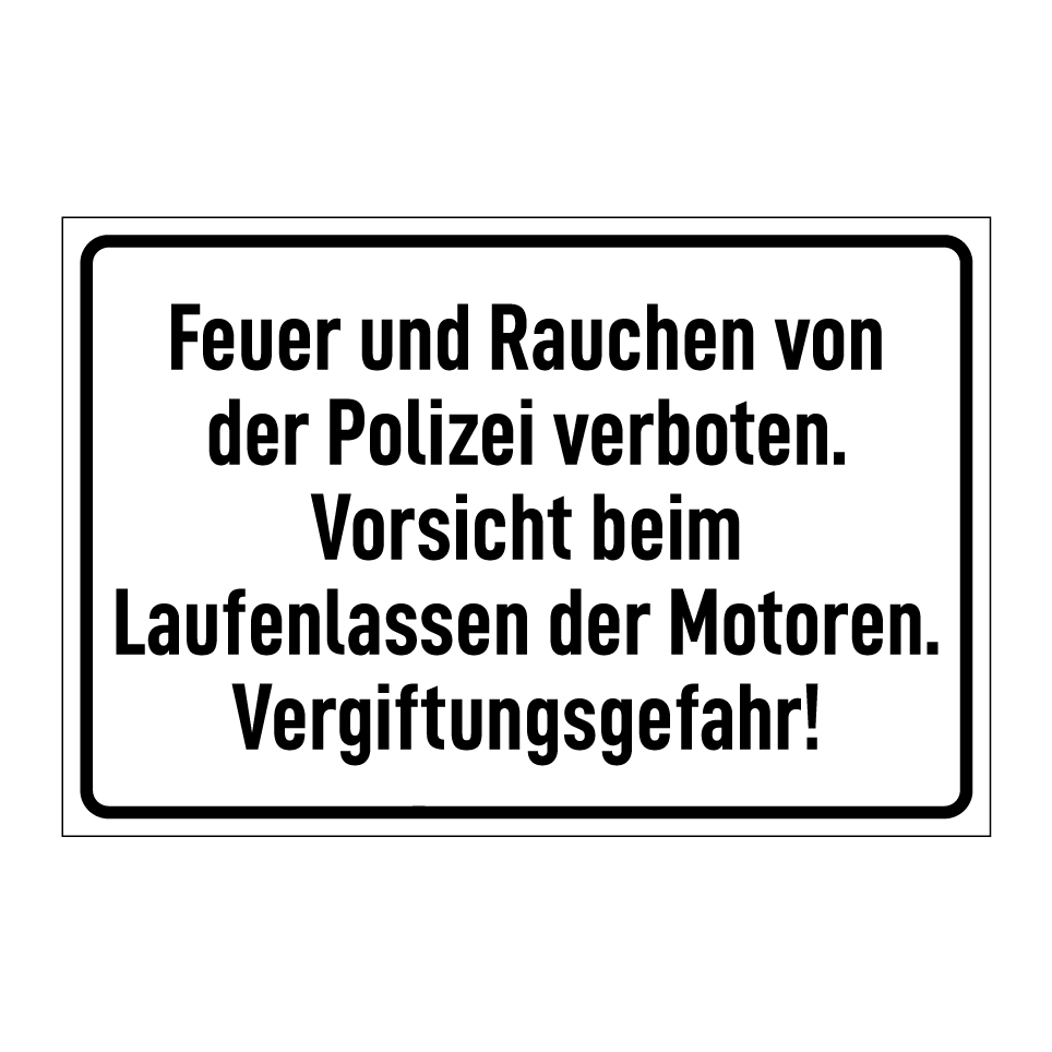 Feuer und Rauchen von der Polizei verboten. Vorsicht beim Laufenlassen der Motoren. Vergiftungsgefahr!