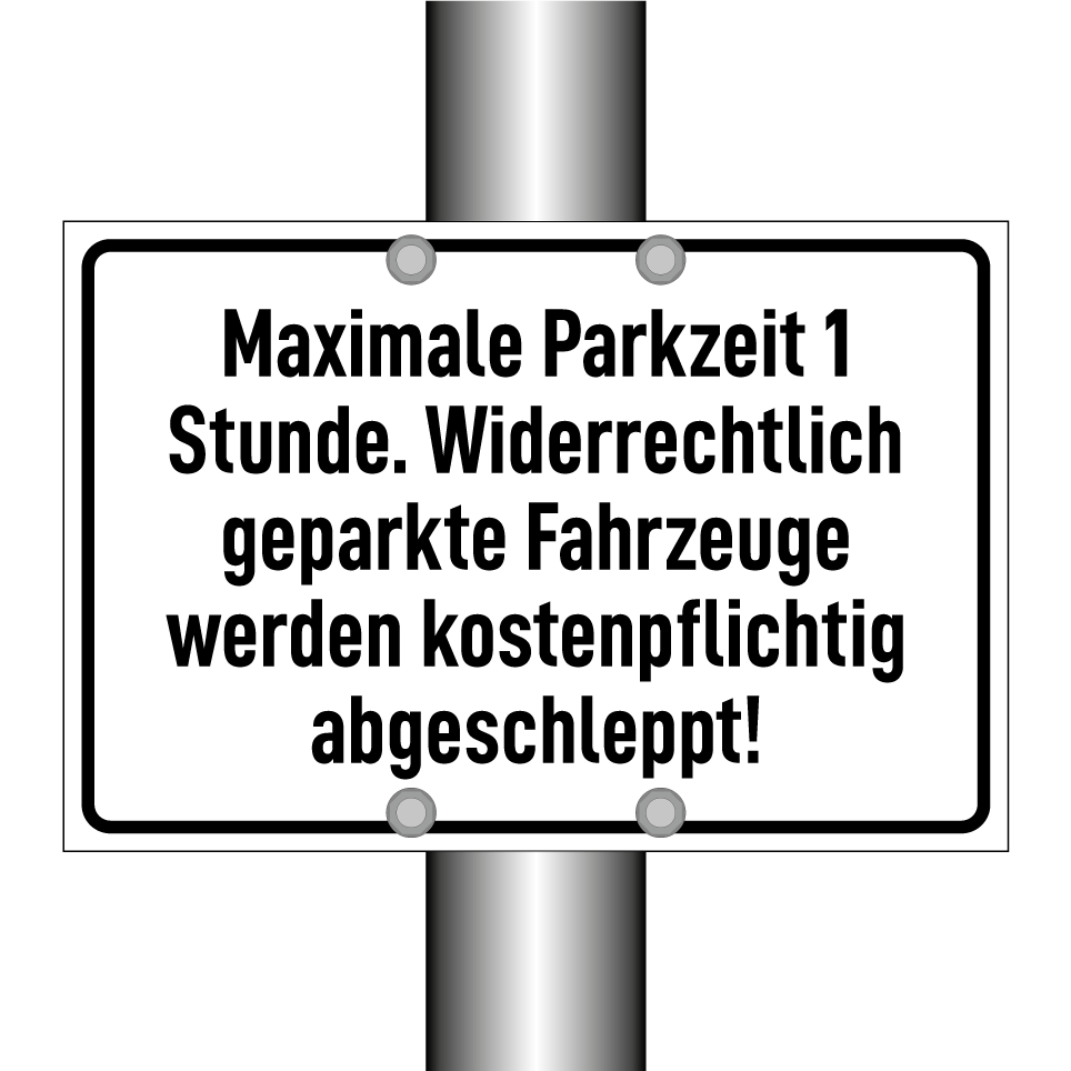 Maximale Parkzeit 1 Stunde. Widerrechtlich geparkte Fahrzeuge werden kostenpflichtig abgeschleppt!