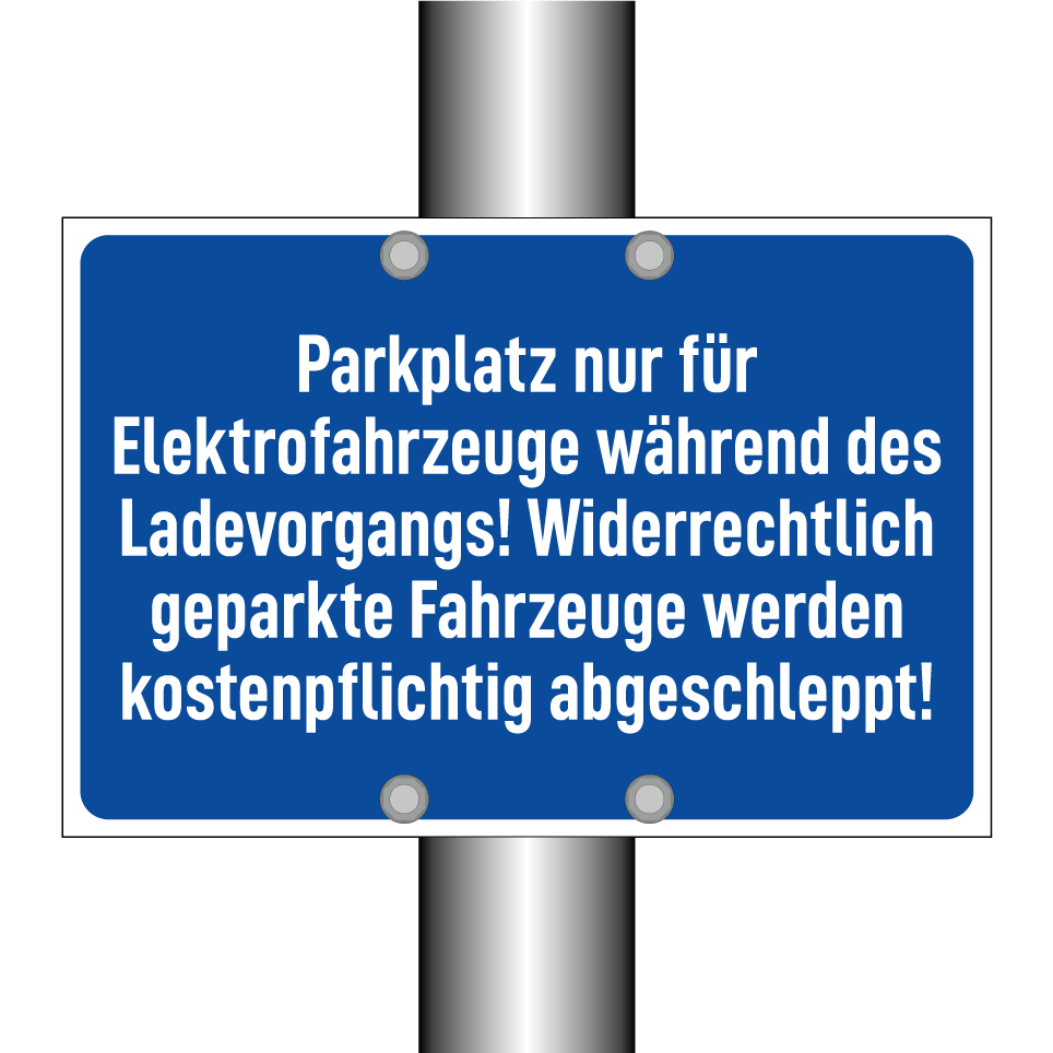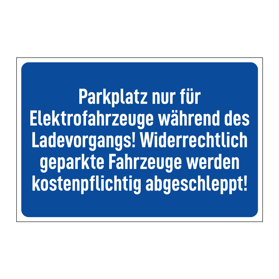 Parkplatz nur für Elektrofahrzeuge während des Ladevorgangs! Widerrechtlich geparkte Fahrzeuge werden kostenpflichtig abgeschleppt!