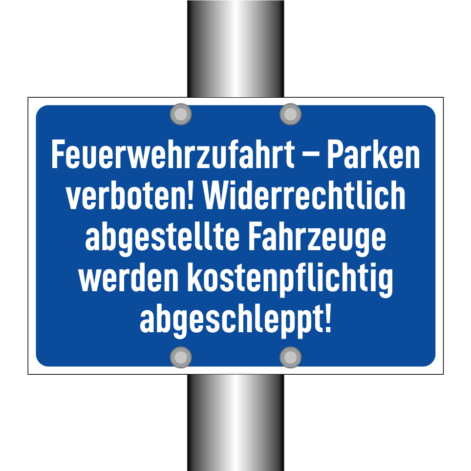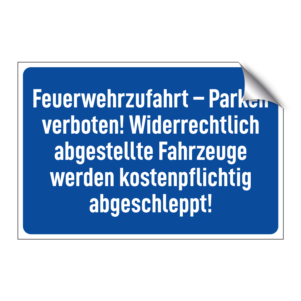 Feuerwehrzufahrt – Parken verboten! Widerrechtlich abgestellte Fahrzeuge werden kostenpflichtig abgeschleppt!