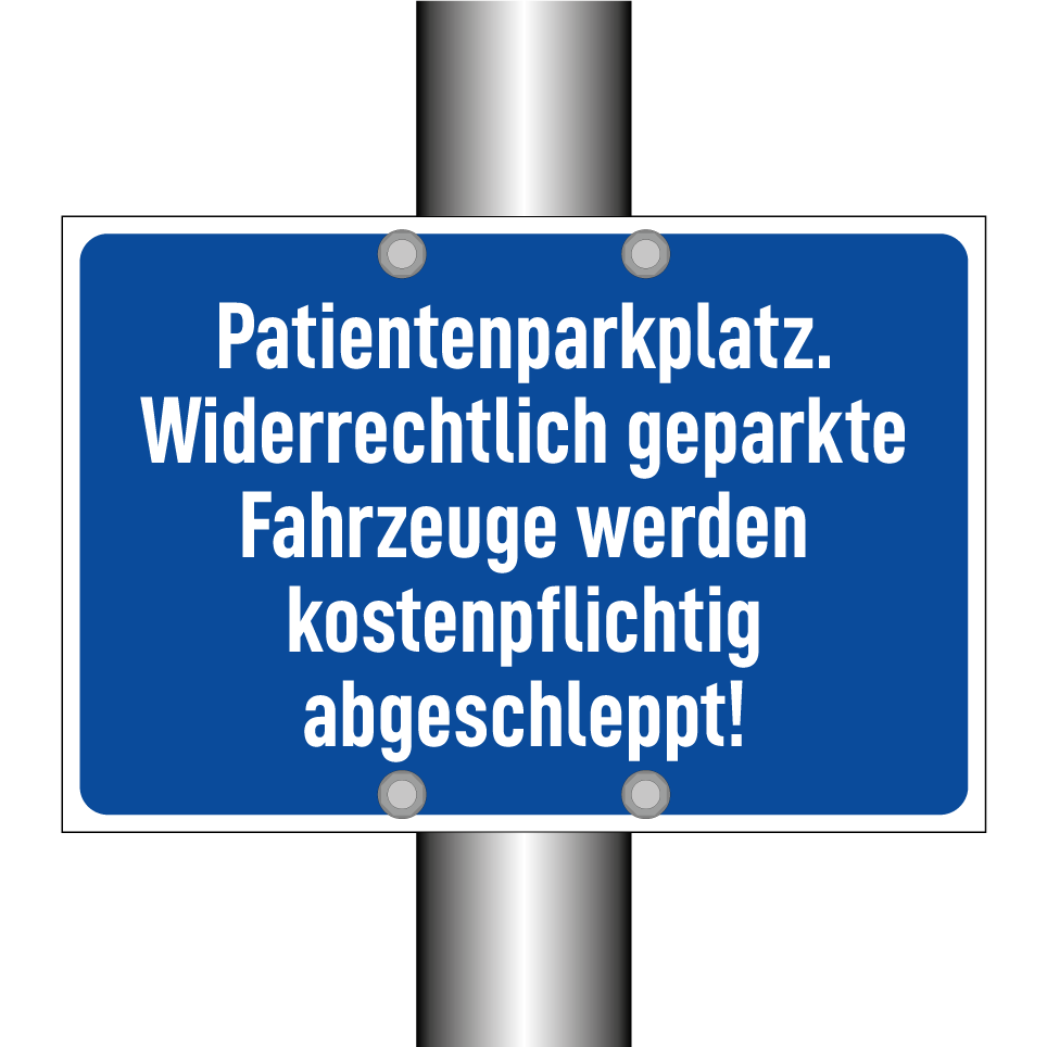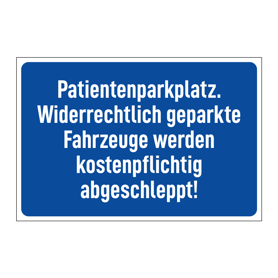 Patientenparkplatz. Widerrechtlich geparkte Fahrzeuge werden kostenpflichtig abgeschleppt!