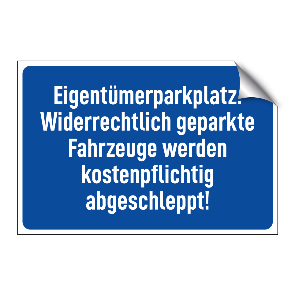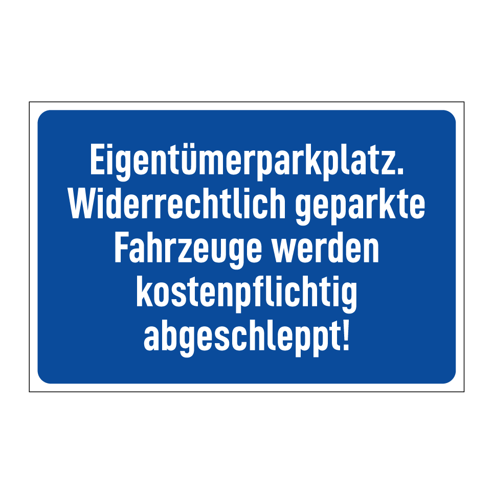 Eigentümerparkplatz. Widerrechtlich geparkte Fahrzeuge werden kostenpflichtig abgeschleppt!