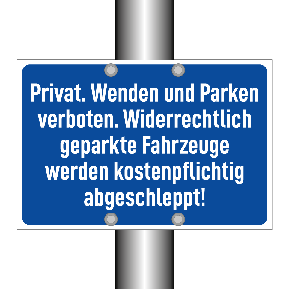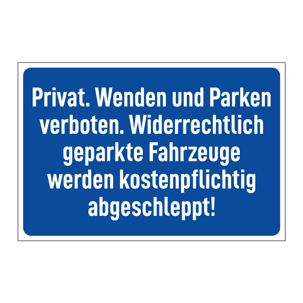 Privat. Wenden und Parken verboten. Widerrechtlich geparkte Fahrzeuge werden kostenpflichtig abgeschleppt!