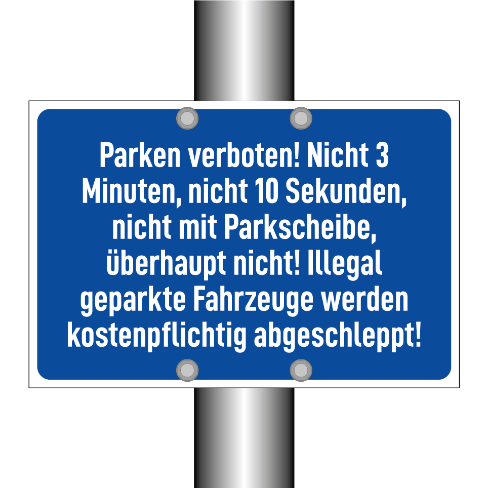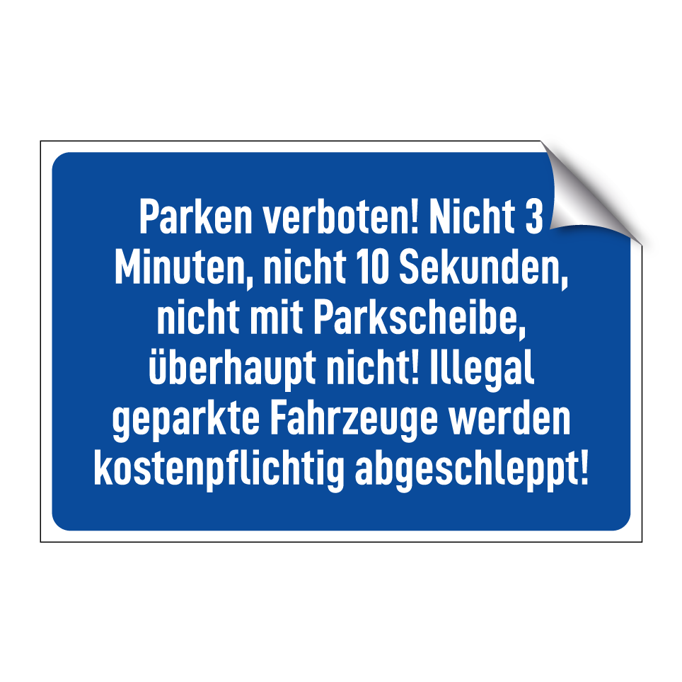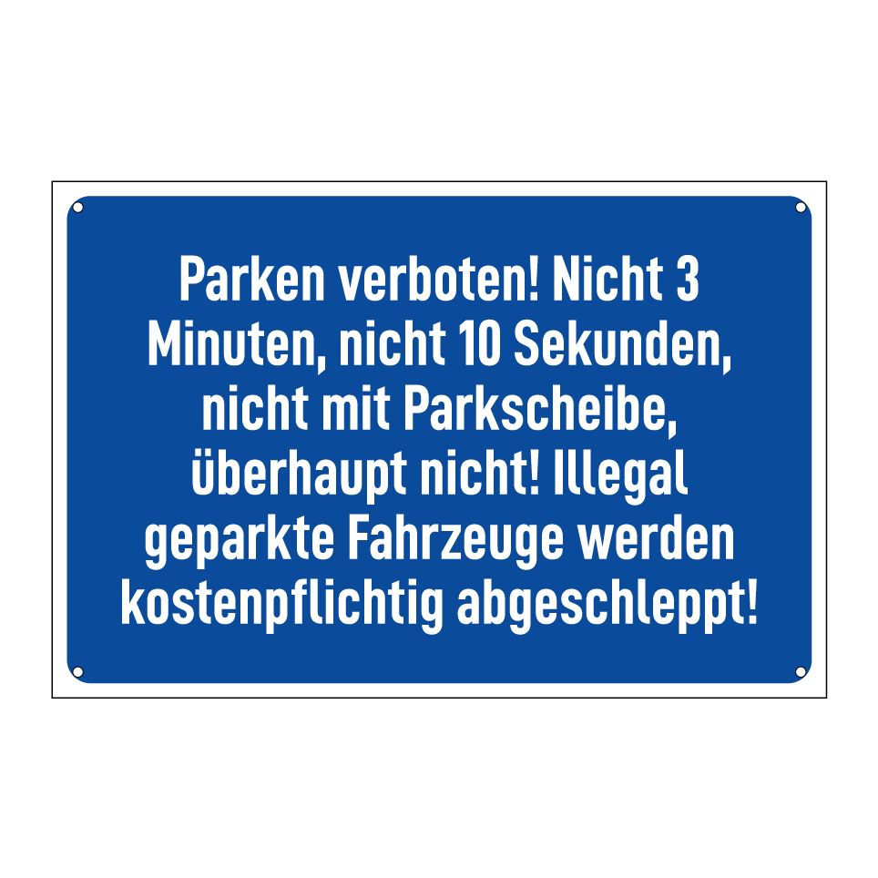 Parken verboten! Nicht 3 Minuten, nicht 10 Sekunden, nicht mit Parkscheibe, überhaupt nicht! Illegal geparkte Fahrzeuge werden kostenpflichtig abgeschleppt!