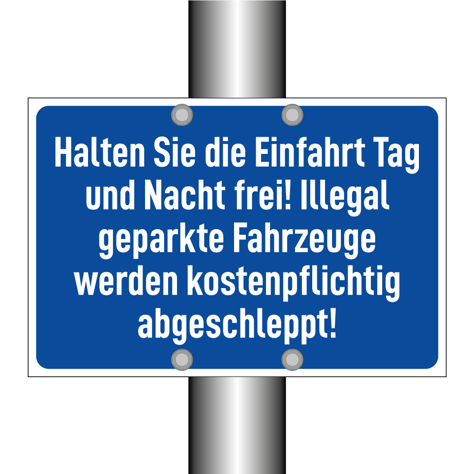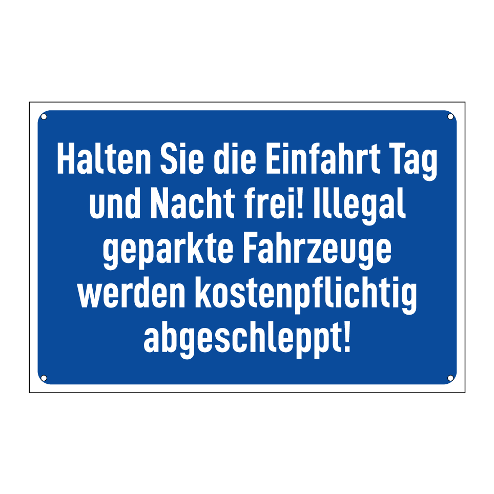 Halten Sie die Einfahrt Tag und Nacht frei! Illegal geparkte Fahrzeuge werden kostenpflichtig abgeschleppt!