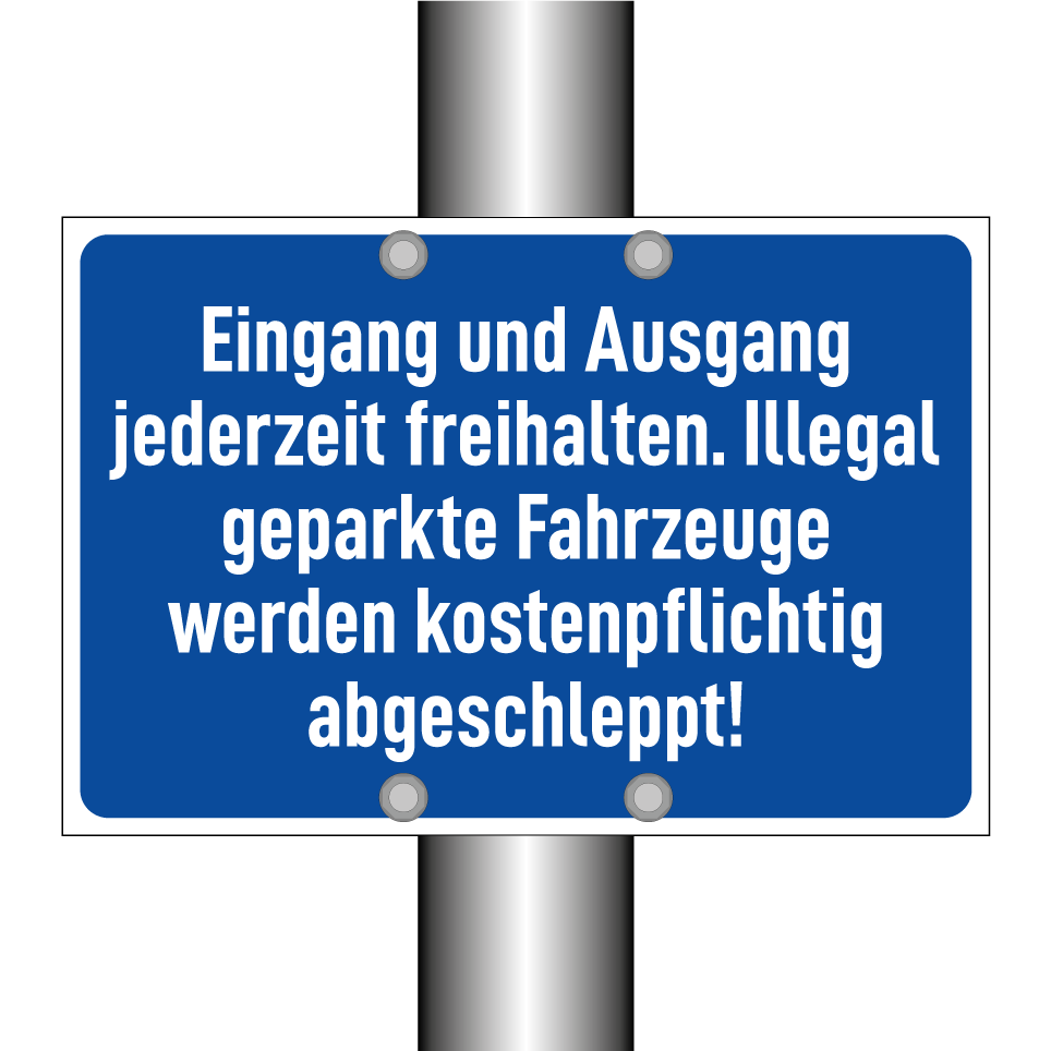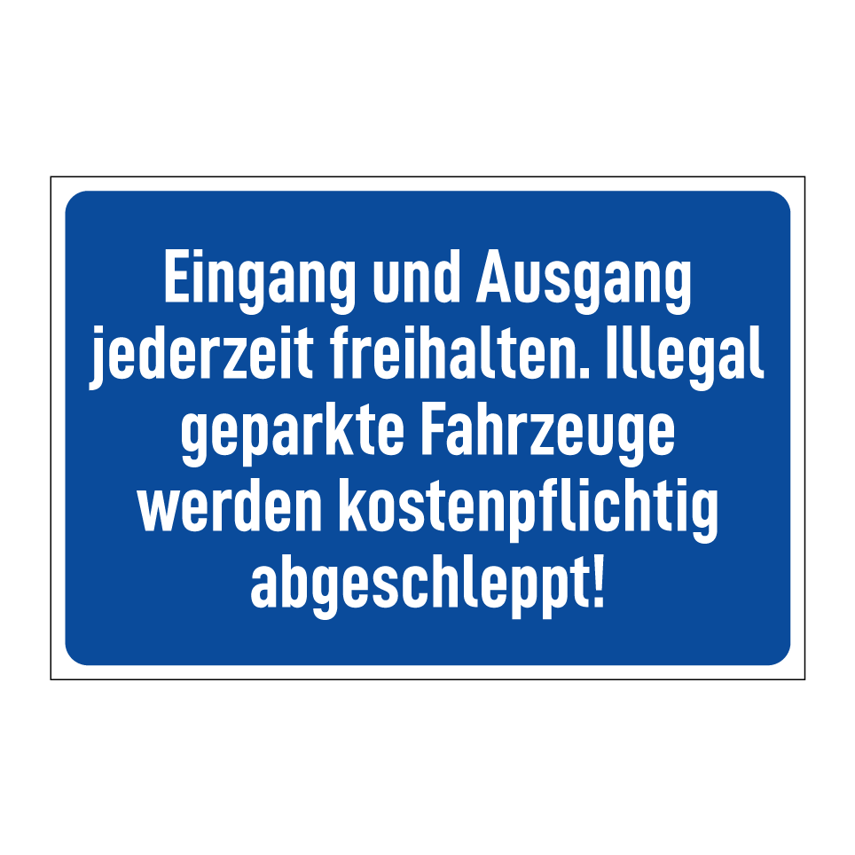 Eingang und Ausgang jederzeit freihalten. Illegal geparkte Fahrzeuge werden kostenpflichtig abgeschleppt!