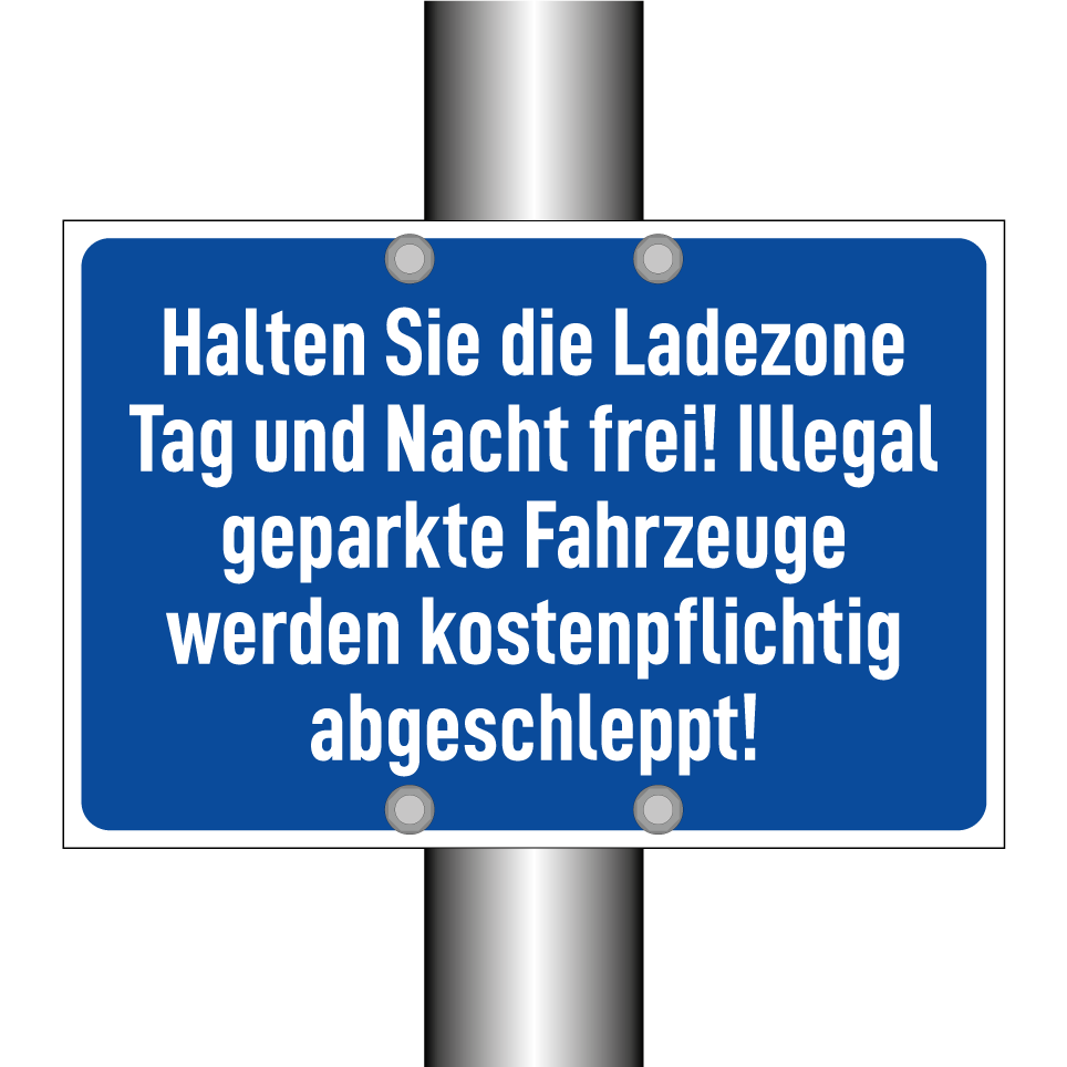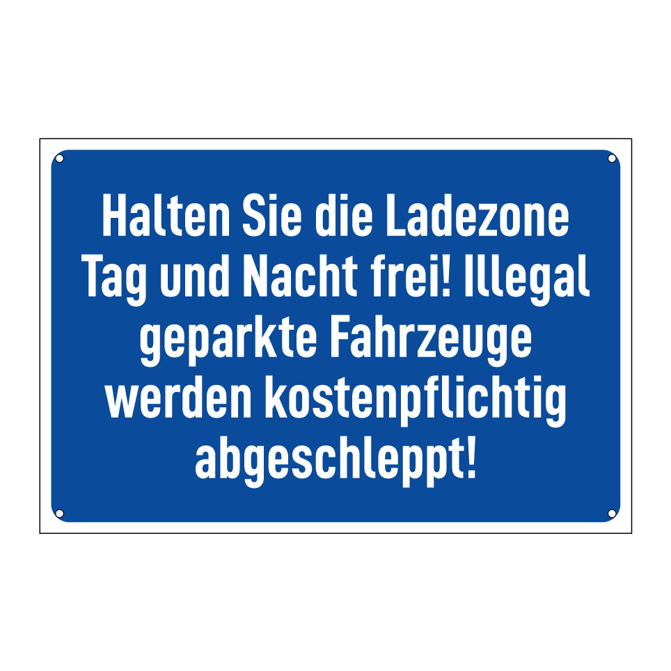 Halten Sie die Ladezone Tag und Nacht frei! Illegal geparkte Fahrzeuge werden kostenpflichtig abgeschleppt!