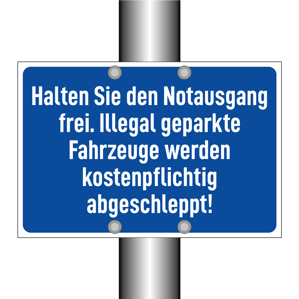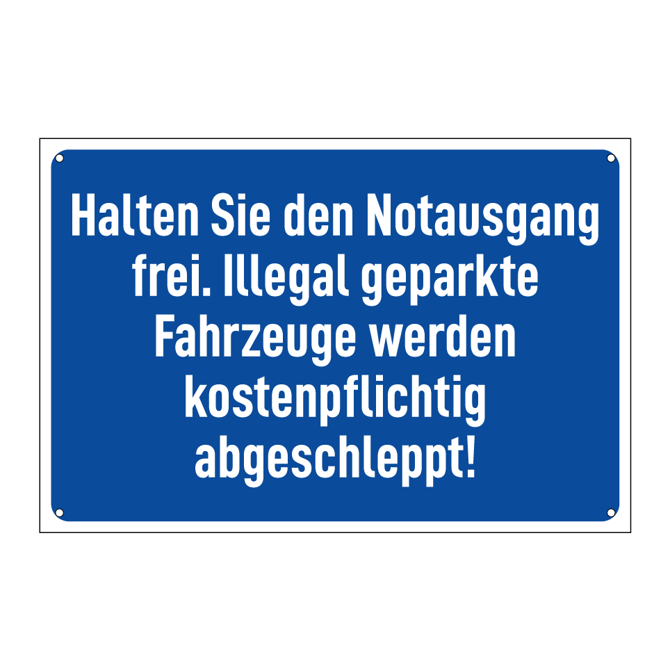 Halten Sie den Notausgang frei. Illegal geparkte Fahrzeuge werden kostenpflichtig abgeschleppt!