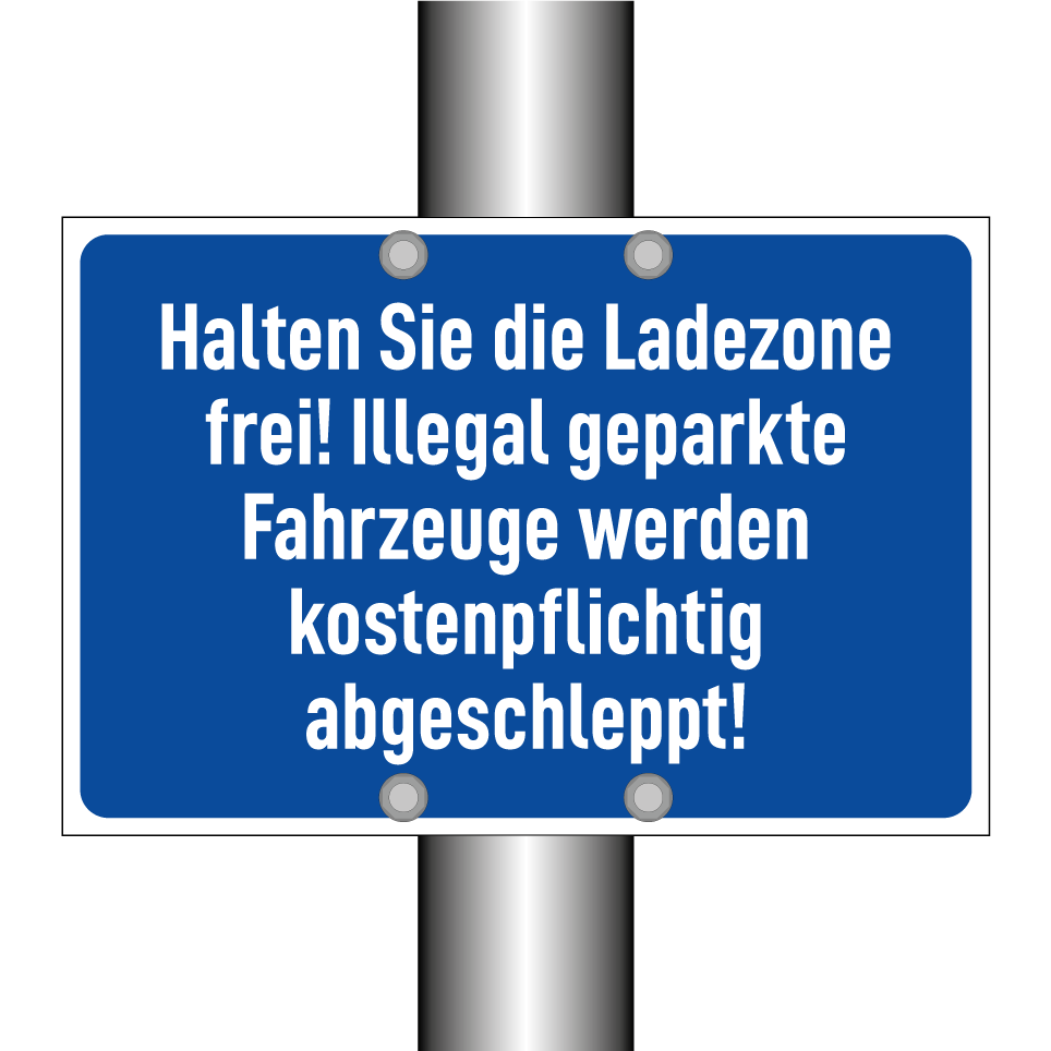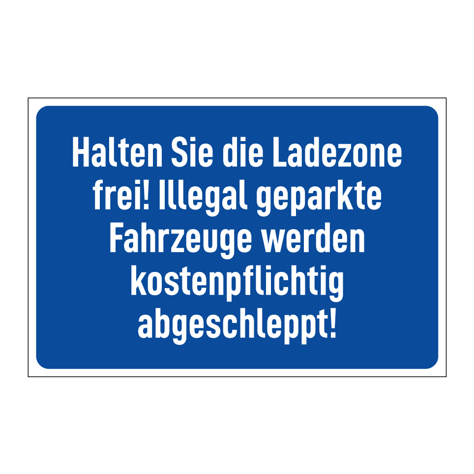 Halten Sie die Ladezone frei! Illegal geparkte Fahrzeuge werden kostenpflichtig abgeschleppt!