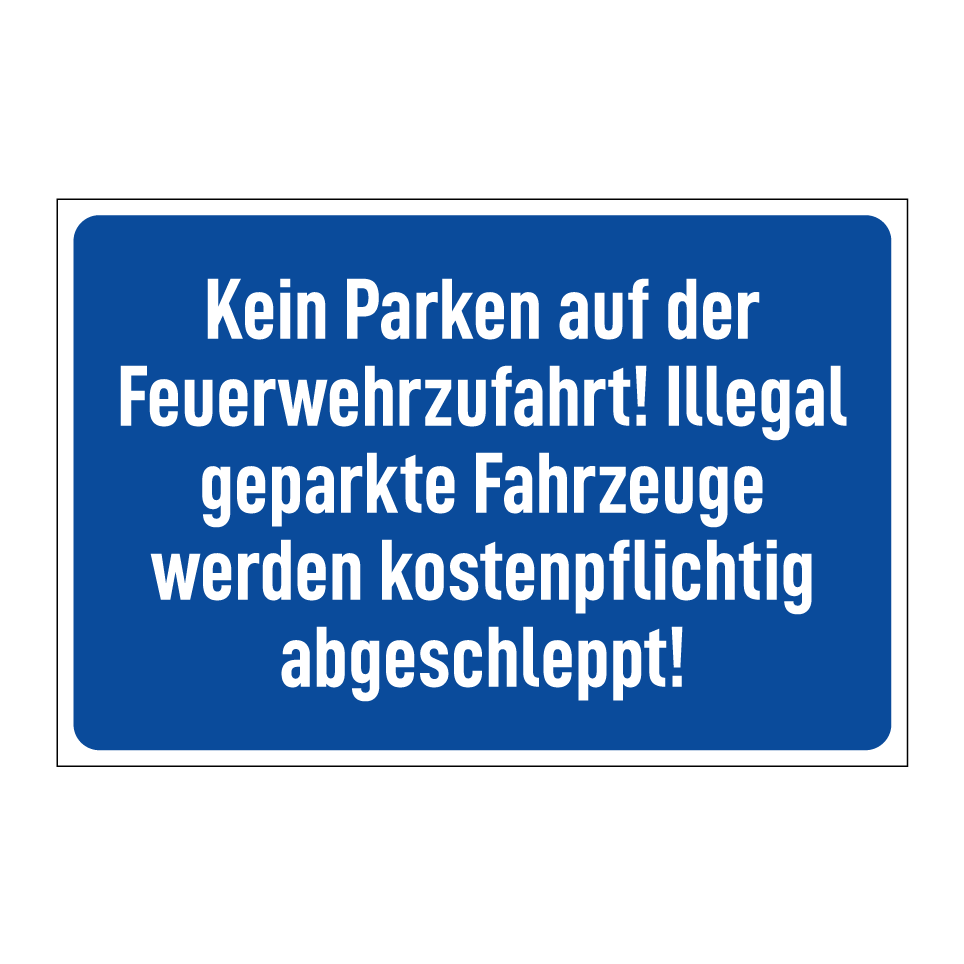 Kein Parken auf der Feuerwehrzufahrt! Illegal geparkte Fahrzeuge werden kostenpflichtig abgeschleppt!