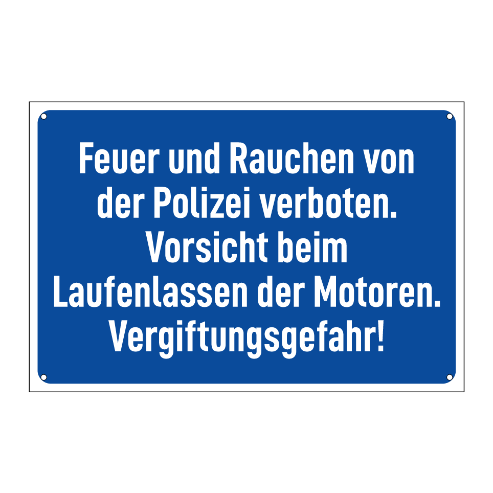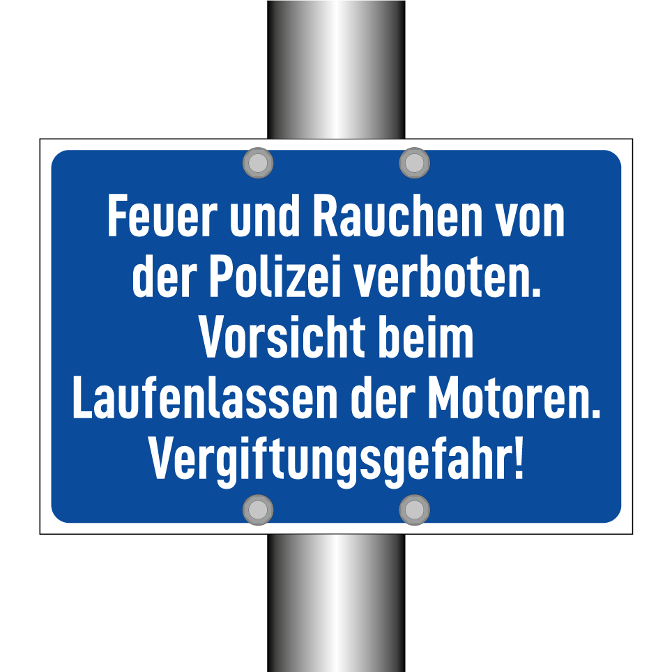 Feuer und Rauchen von der Polizei verboten. Vorsicht beim Laufenlassen der Motoren. Vergiftungsgefahr!
