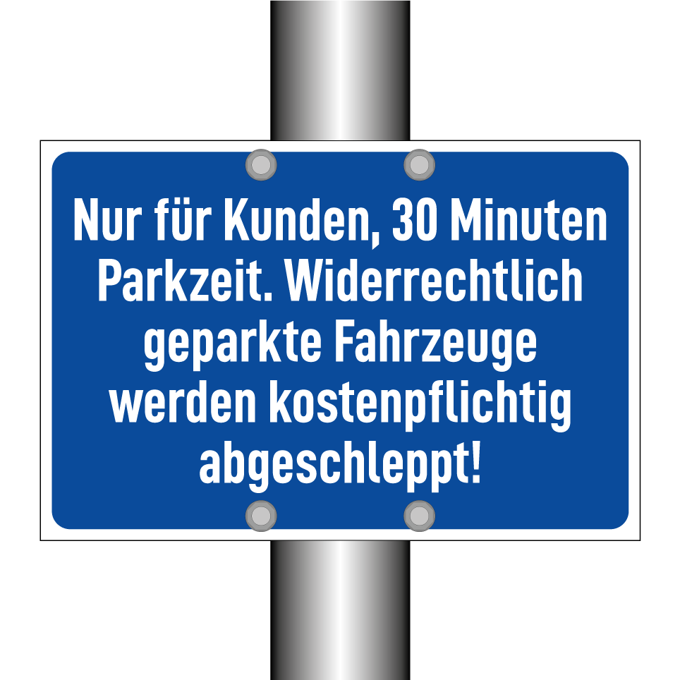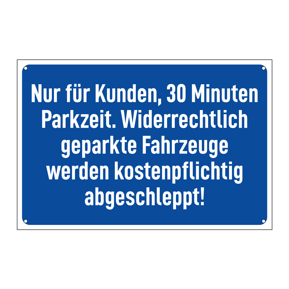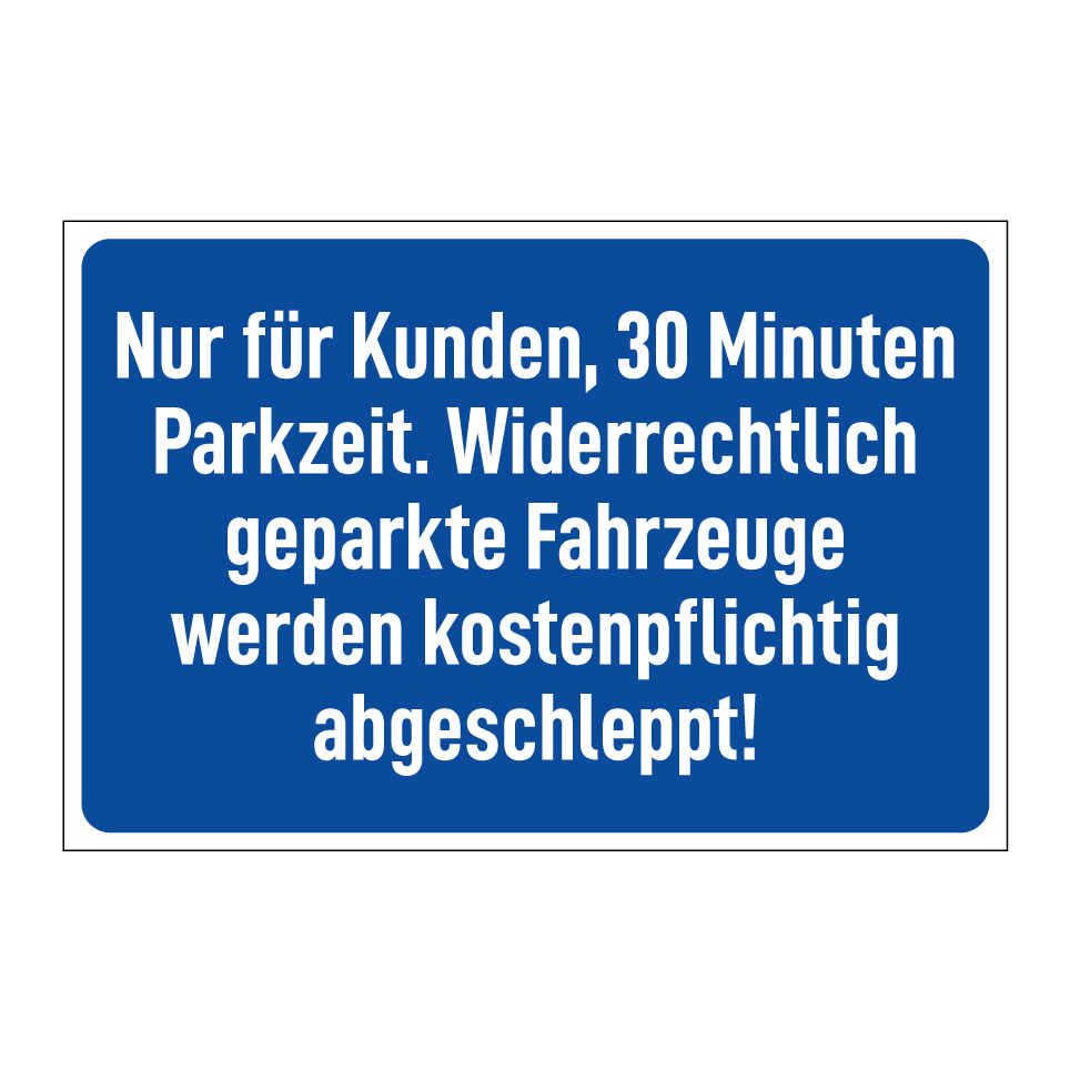 Nur für Kunden, 30 Minuten Parkzeit. Widerrechtlich geparkte Fahrzeuge werden kostenpflichtig abgeschleppt!